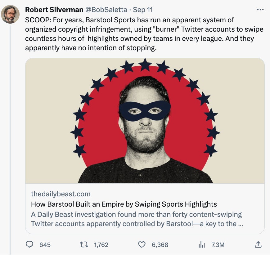 Right off the bat I gotta give it up to good ol' fashioned Journalism. Seriously, stop what you're doing right now, bow your head, and take a 15 second moment of silence for what transpired on 9/11…the death of journalism. This guy Robert Silverman spent what appears to be WEEKS researching that Barstool Sports uses burner accounts to share sports clips on Twitter. Bro even tweeted that it was a SCOOP and that he caught us RED HANDED