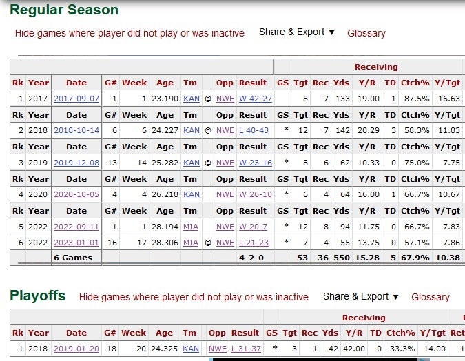 Even Hill's eight-catch performance last year in Miami "only" yielded him 94 yards, which is the second lowest YPRs he's had in his career against them. Still a fine total, but more in keeping with your mere mortal slot receivers as they kept his YAC to manageable numbers.