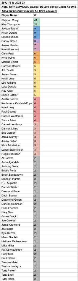 It wouldn't shock me if someone like Danny Green surprised some people, but I'm fairly certain those are all just huge late game dagger corner threes. The same guy who could be 0-10 would somehow always hit that one late corner three. The surprising thing with Green is more the players he's listed over. Harden, Kawhi, Luka, shit I feel like Luka has way more than 5 since he entered the league so that's a little nuts.