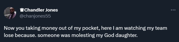 All we can do is surmise that someone is in need of need of professional help. There's a child in grave danger, or a we've got a grown man on the internet making vague, obtuse references to a horrifying crime. But in the context of wanting to make money sacking quarterbacks. Either would be a terrible situation, even if only a sliver of it is true. And based on this tiny bit of information, the best thing that could happen is the authorities get very much involved, sort it out, and get whoever needs the support all the assistance humanly possible.