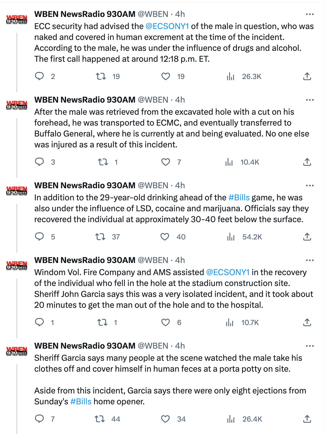Once the rescue team arrived on scene, it took approximately 20 minutes to get the fan out of the hole and to Erie County Medical Center, where he was treated for a short time before being transferred to Buffalo General. There was no mention of how long the man was trapped in the hole, although the thread does state that the first call concerning the man came in at 12:18 p.m. local time.