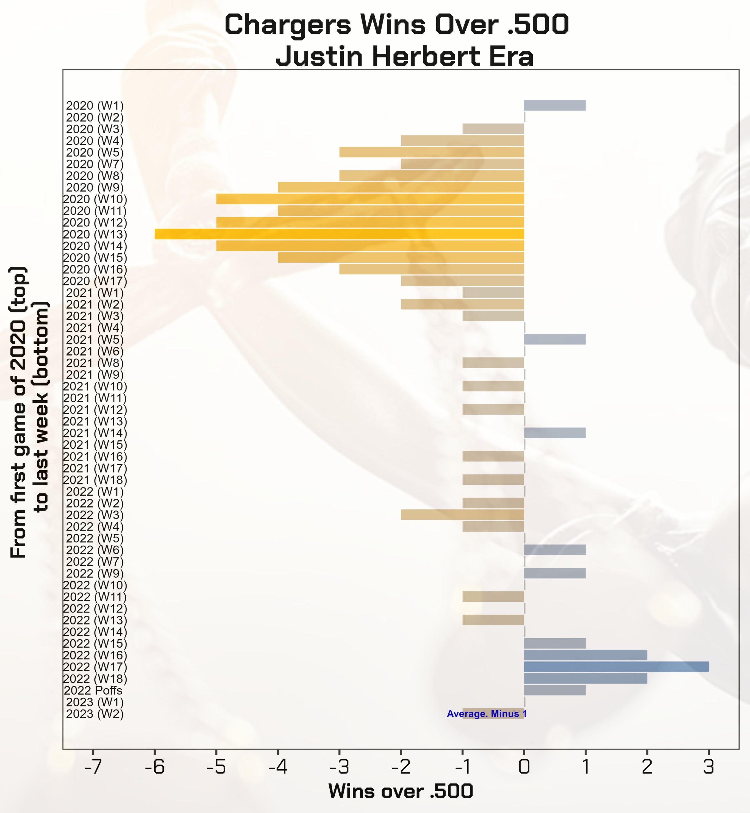 The Justin Herbert era was supposed to break the spell. Drafted in 2020 when the Chargers sat comfortably on their rightful average throne with 452 franchise wins and 452 franchise loses. The graph belows shows their franchise wins above .500 by week starting in 2020 from the top going to the present day at the bottom at -1 where the Chargers have found themselves 13 times during this era.