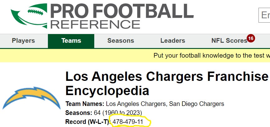 The franchise win/loss/tie record for the NFL's Los Average Chargers as it stands the date of this blog's posting. A team that was exactly .500 before losing last week to an also average Tennessee Titans team in an amazingly average affair. Even after regulation the Chargers entire franchise would remain .500 until - like pretty much always - they found a way to slip back just beneath the cozy covers of average by losing in overtime.