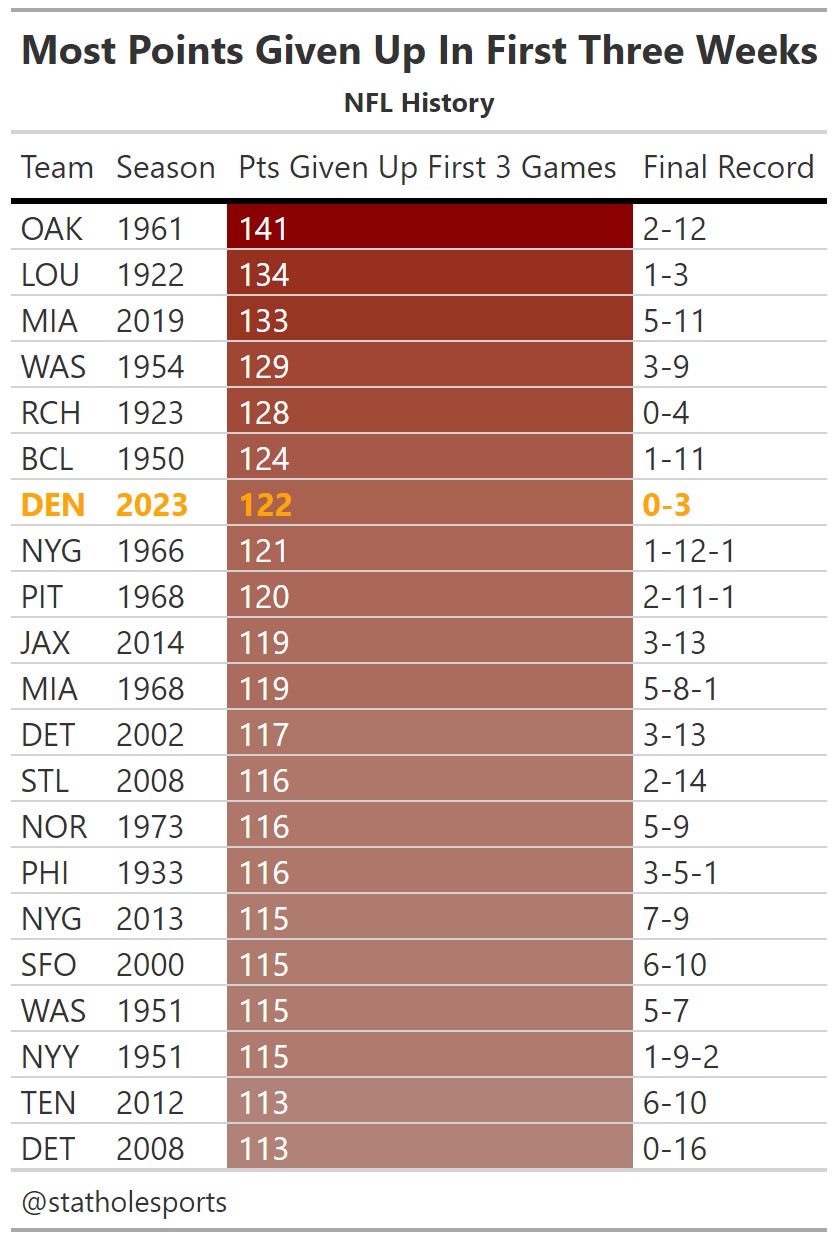 Sad Stat #2: The Broncos are one of seven teams in NFL history to give up 122 points in the first three weeks of a season