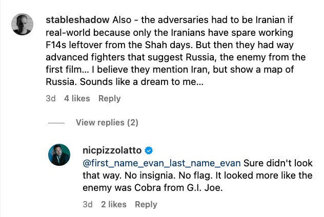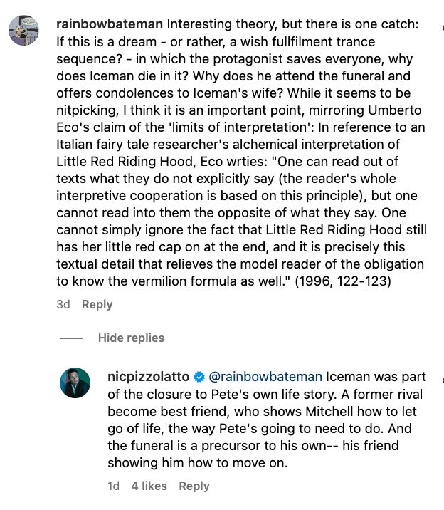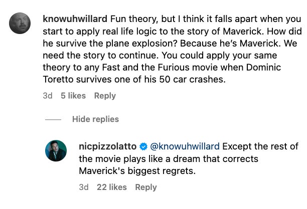 And I am 💯 that Pete Mitchell died (on purpose) flying the stealth fighter in the opening of Maverick, and what proceeds is his last experience in consciousness-- a rewriting of his own past where he saves everything he couldn't in life.