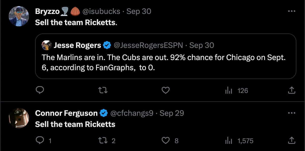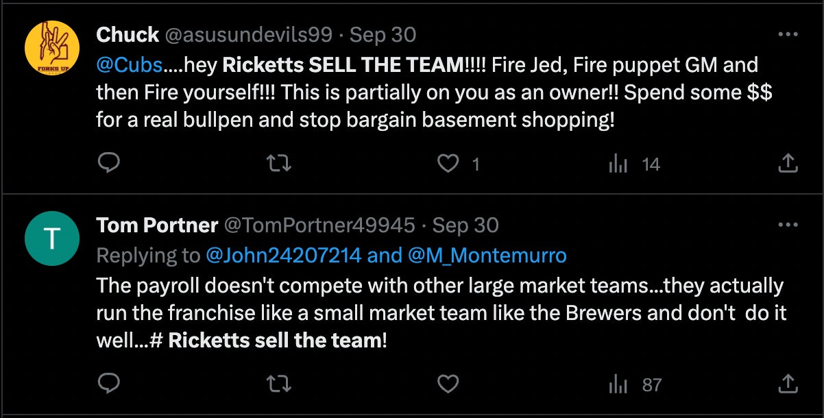 Before we get to that, I'm going to shift my focus to the team on the North side of town, the Chicago Cubs. I've noticed a lot of Cubs fans shit talking the Ricketts for the current state of the Cubs, and it makes me want to jump off the Sears Tower. Here are a few examples from a 2 second search on Twitter: