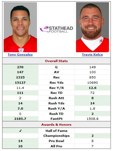 This is no slight to Kelce. Though if I were a Chiefs fan over the age of say, 35, I'd be arguing that he's got a long way to go for me to consider him better than Tony Gonzalez yet, who is Top 10 in some receiving categories all time, regardless of position: