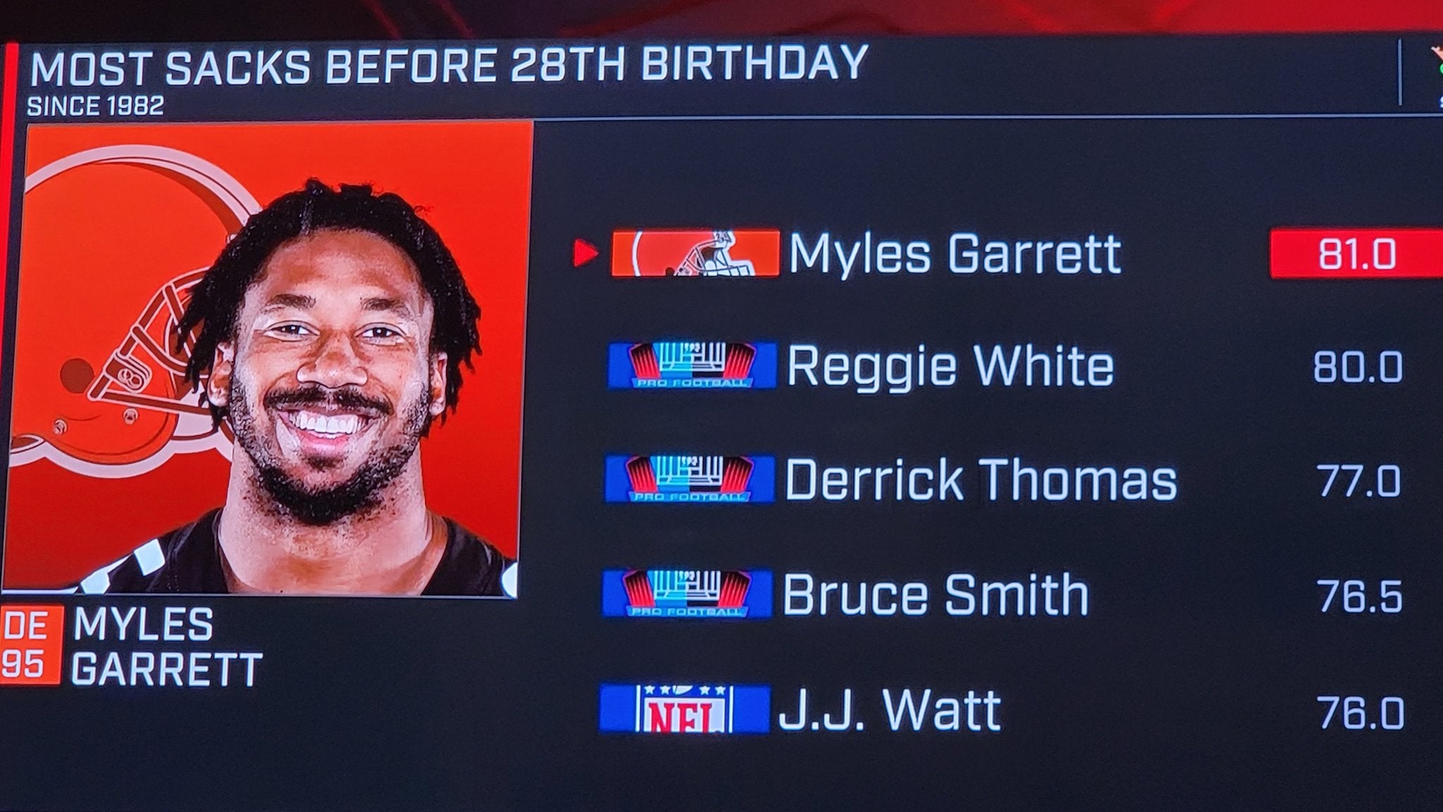 That has to go down as the best one half of football by a defensive player in NFL history. And while I'm sure the NFL is going to finish the season, Myles Garrett has already locked up the Defensive Player of the Year, right? And by definition, shouldn't he be the MVP too? Find me someone more valuable to their team than Myles Garrett is to the Browns. You literally cannot. We'd by down 21-0 without him today, but with him, we're up 27-21.