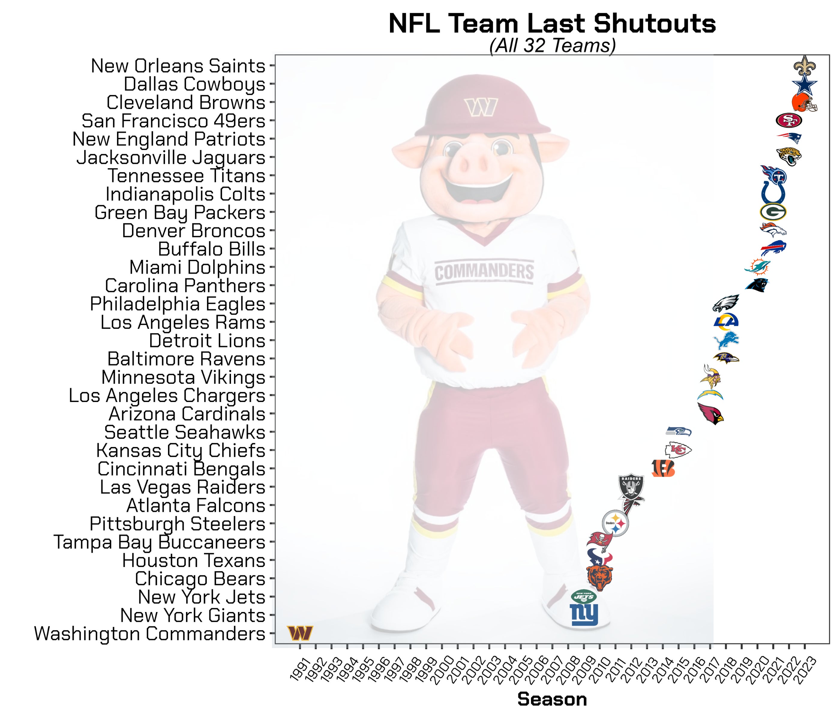 Let this be a sad stat lesson. Just because the Commanders won in Week 9 doesn't mean they are absolved from making the blog. Also slow developing bladders are more common than you think. Seriously though, I had no idea this gem of a streak was a thing until researching the Browns last shutout and comparing it with every other team. But Sunday marked the Commanders 529th game without a shutout going back to their Super Bowl winning 1991 season. The Commanders franchise has literally won a Super Bowl before shutting out any team.