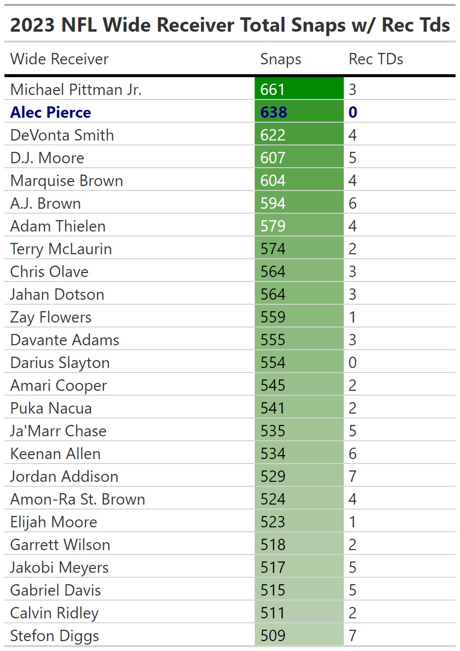 Alec really is just out there for his health. But not his mental health. He trails only teammate Michael Pittman Jr. in total snaps for a wide receiver this season and has yet to score. Darious Slayton is the only other name to fail to score as shown below, but that's understandable since he's depending on a Goodfellas character to get him there.