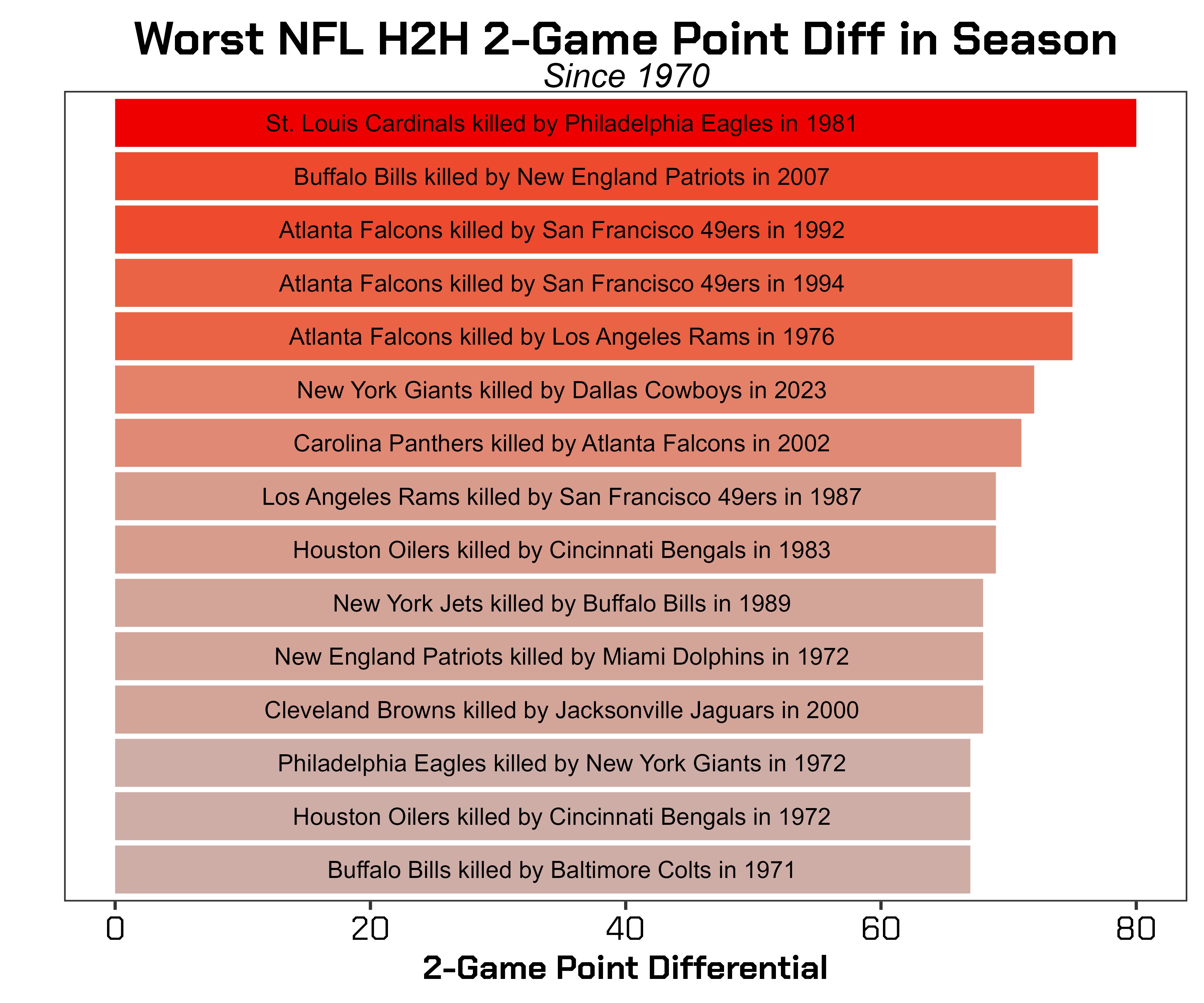 Count me as shocked to all hell the Giants didn't make #1 on this particular niche stat. You may recall the 40-0 drubbing at home the Giants took vs Cowboys in Week 1. But let's pay some respect to the St. Louis Cardinals of 1981 losing 52-10 to the Eagles in Week 10 and getting shutout by them 38-0 in Week 16 for a differential of -80. The Giants did get close though, sitting at -79 with a just a few minutes left. But it wasn't meant to be and the Cardinals' banner of sadness flies above the Giants and the four other teams in-between: the Bills, the Falcons, the Falcons, and Falcons.