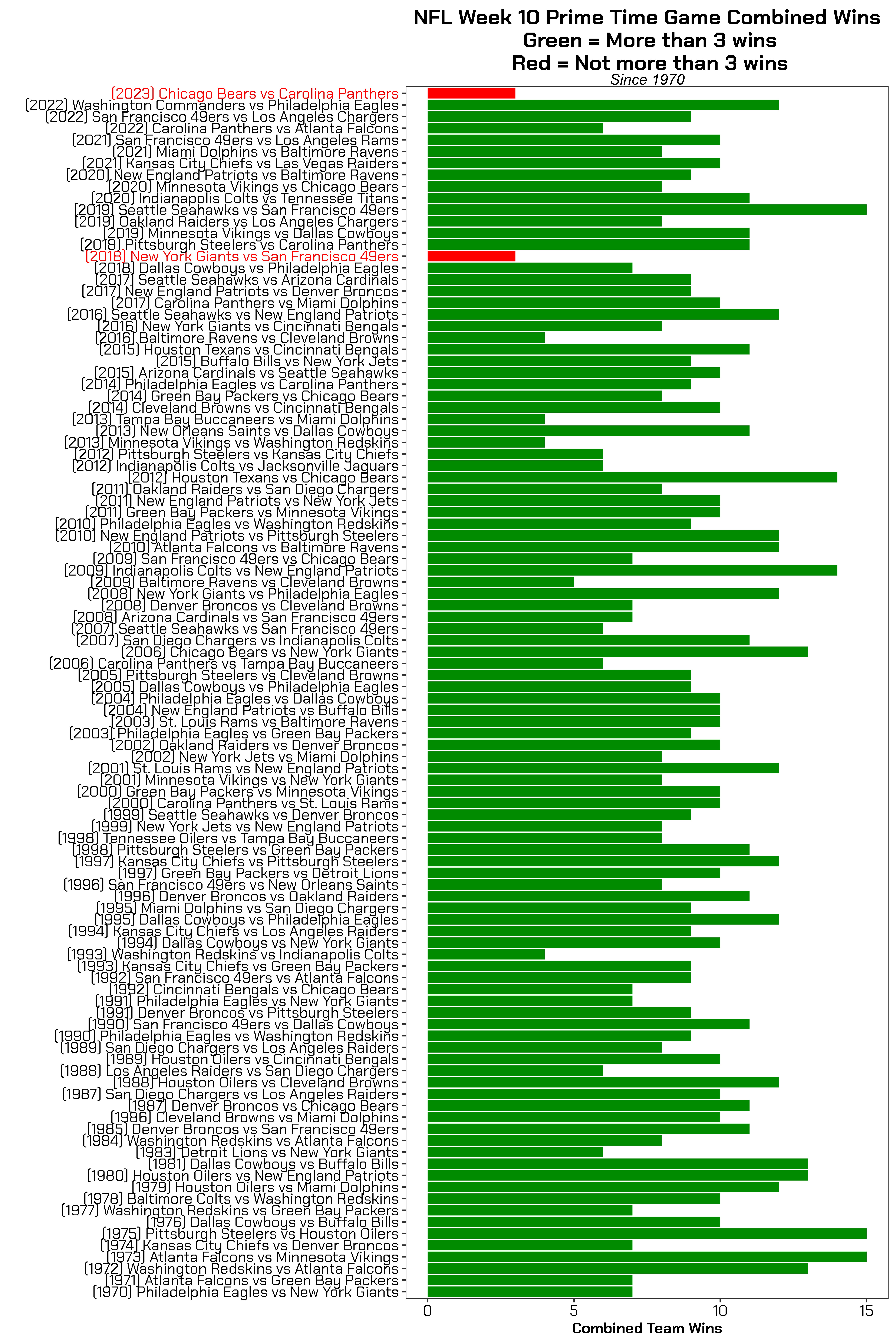 Chronological order from top to bottom are the last - idk - shit ton of prime time games since 1970 up to last Thursday Night with the bars representing combined team win totals heading into the matchup: