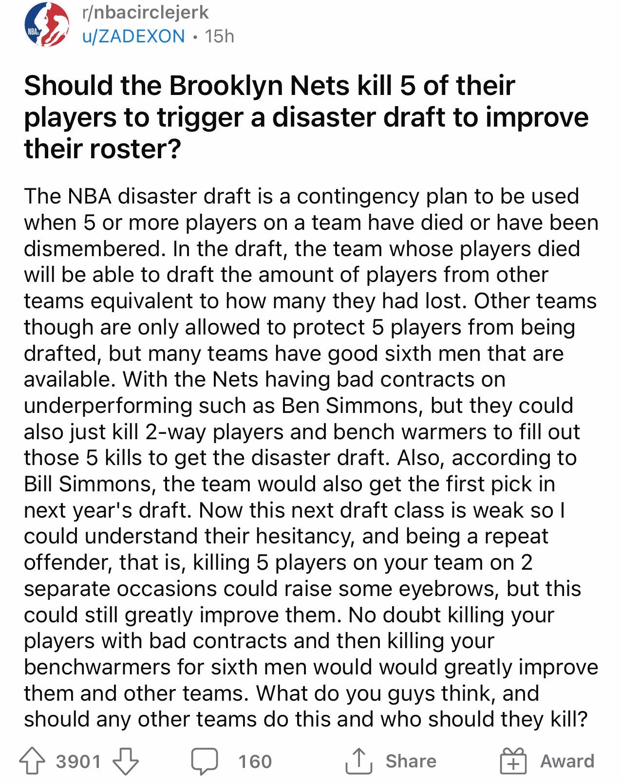 Nets Fans Have Now Resorted To Disaster Draft Scenarios Which Would Only Happen If 5 Players Died To Try And Fix Their Team