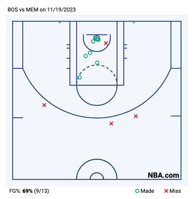 Again I'll ask you, when was the last time the Celts ever got this type of production offensively from their center? This is cheat code basketball, even against a team that has the reigning DPOY. Whenever Porzingis found himself switched onto a smaller player like Desmond Bane, he immediately turned it into points (4-4). I LOVED his court awareness late in the 4th quarter when Tatum was operating into the post and he smartly cut off ball to the rim for an easy find and dunk. I don't think I've seen a Celtic player do that once in the last 3 years when Tatum is operating out of the post let alone their fucking starting center. But that's the beauty of Porzingis. It's not just his skillet that's amazing, it's how he sees the floor. He has a great sense of spacing and when and where to move without the ball, which might be the #1 thing the Celtics offense has needed.