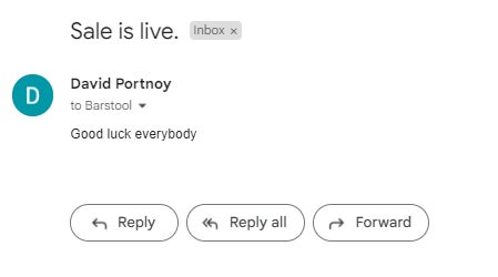It's Thanksgiving evening. Keep in mind I'm in California, so the timing is way off. West Coast people live 3 hours in the past. I'm eating Thanksgiving dinner at like 8 PM EST. I'm enjoying my rotisserie chicken, mac n' cheese, and green been casserole. Everything is going swimmingly. Then I receive this email from Dave Portnoy.