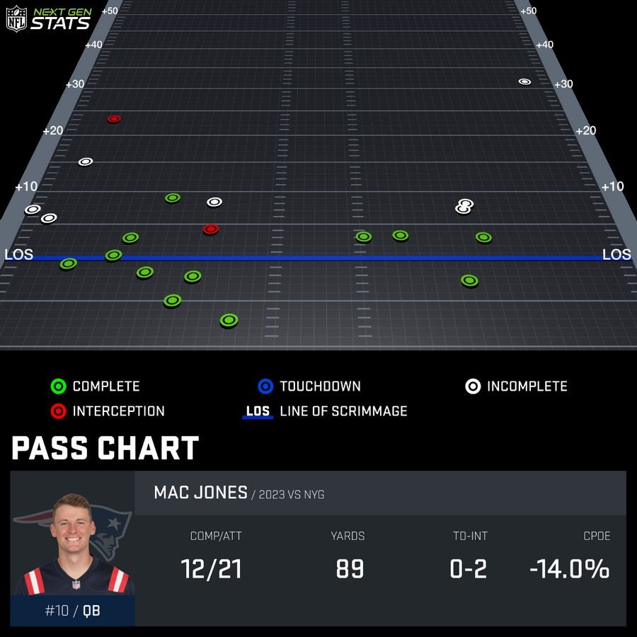 --Which is not to suggest I think Zappe is the answer to our prayers. He put together a touchdown drive courtesy of some Douglas catch-and-runs and Stevenson power rushes, but it should be lost on no one that he's had every opportunity any backup could hope to be offered to take the QB1 job from Jones and hasn't. He's never outplayed Jones. Not in camp, not in practices, and not in the games where he's come off the bench. And don't fall into the trap of thinking that because he led a touchdown drive that the rest of the team play better in front of him or bring more energy or any of that claptrap. After Jones had played 30 minutes and Zappe 15, their stat lines were almost exactly 2-to-1: