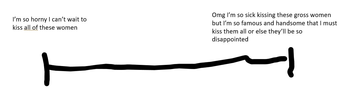 Gun to my head, I really think he falls on the right side of the spectrum. It's easy to make the joke that Richard Dawson was just a horny old man who wanted to kiss as many women as possible, but I don't think that's where his head was at. I think he thought so highly of himself that in his mind "it was an honor" to be able to kiss him. And if he didn't kiss every woman on the show, they would be soooo incredibly disappointed. Which I guess is probably true. But did the women want to kiss him because they loved Richard Dawson so much, or did they want to kiss him because for peer pressure reasons. He kissed everyone before them, so it would be embarrassing if they didn't get a kiss themselves.