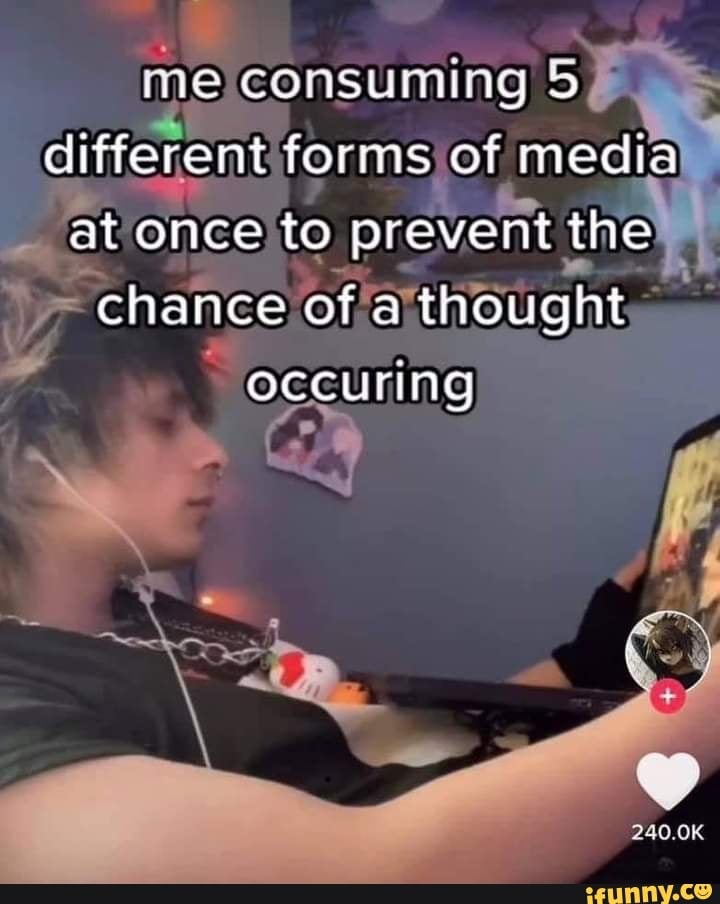 I don't know if anybody else experiences this, but sometimes I'll go really long stretches of time where I only listen to podcasts. Which you should do too. Specifically Barstool Sports podcasts. But then after like a 3 month period of only podcasts I'll listen to music again and think, "Holy shit.. music is so fucking good." Like somehow I had forgotten about music or something. It's very stupid. I actually think there's a direct correlation between how happy I am, and how much I'm listening to music. When I'm in a good mood, I listen to music. But when I'm sad, or stressed, I'm more likely to listen to a podcast to distract my brain from having real thoughts. Kind of like this meme.