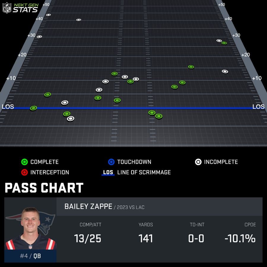 --Based on the game plan, I'm guessing that Zappe's Prime Directive from Belichick's Starfleet Command was: "Do Not Turn the Ball Over." He had five completions on 12 attempts for 39 yards in the 1st half. Of those five, three were at or behind the line of scrimmage. Another was for 2 air yards, and the longest traveled 8. That's the very definition of coaching not to lose and just hoping your defense (we'll get to them) can either put you in a position to score or score for you. Belichick and O'Brien took the Parental Controls off Zappe somewhat in the 2nd half as his spray chart would indicate. With some honest-to-God attempts of more than 10 yards: