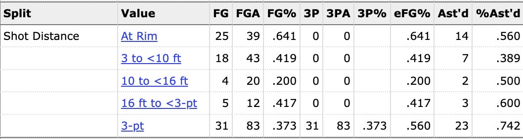 Jrue was a team worst -15 in his 38 minutes with his 3-9 (1-5). Not getting anything defensively and then also not getting anything offensively can't really happen. Especially on a night where there's no KP and everyone sort of has to play up a level. The concerning part with Holiday is the fact that he's currently shooting 37% on drives this season. The offense is still nowhere close to what I think anyone expected, even with his reduced role. This is a guy who never shot under 47% and had 2 seasons over 50% as a Buck, yet he's down to just 42% from the floor this season, struggling in basically every zone