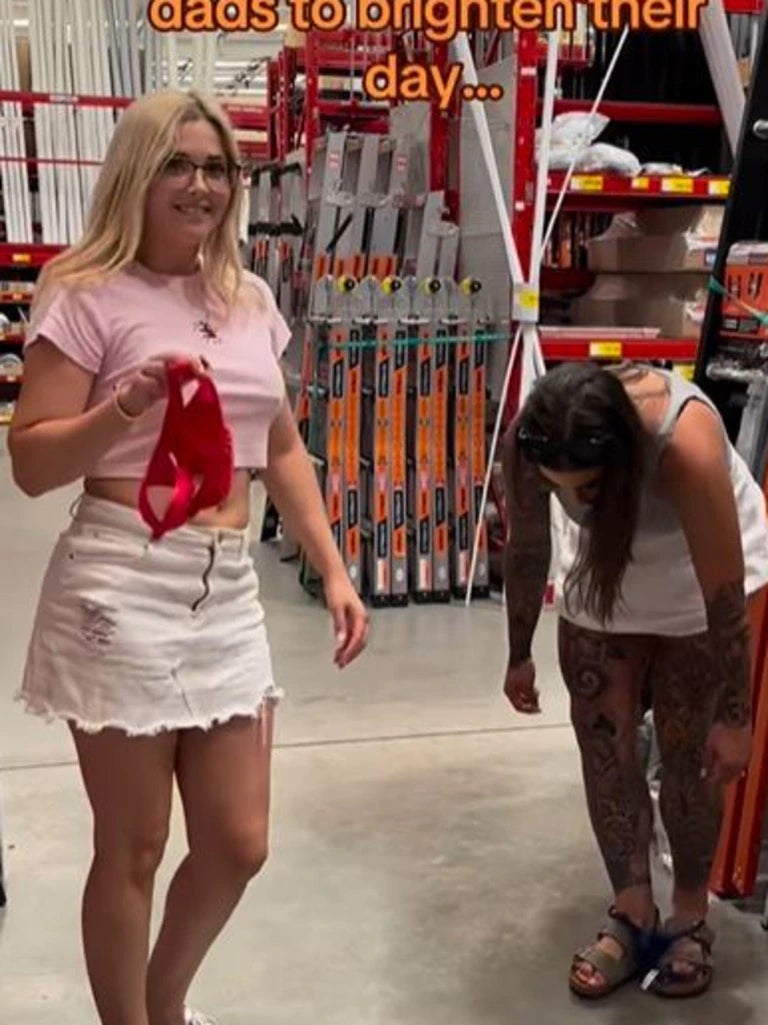 In one of her clips, she and a friend filmed themselves jokingly taking their underwear off and leaving them in parts of Bunnings as a “surprise for the dads” and the “hard working tradies”.