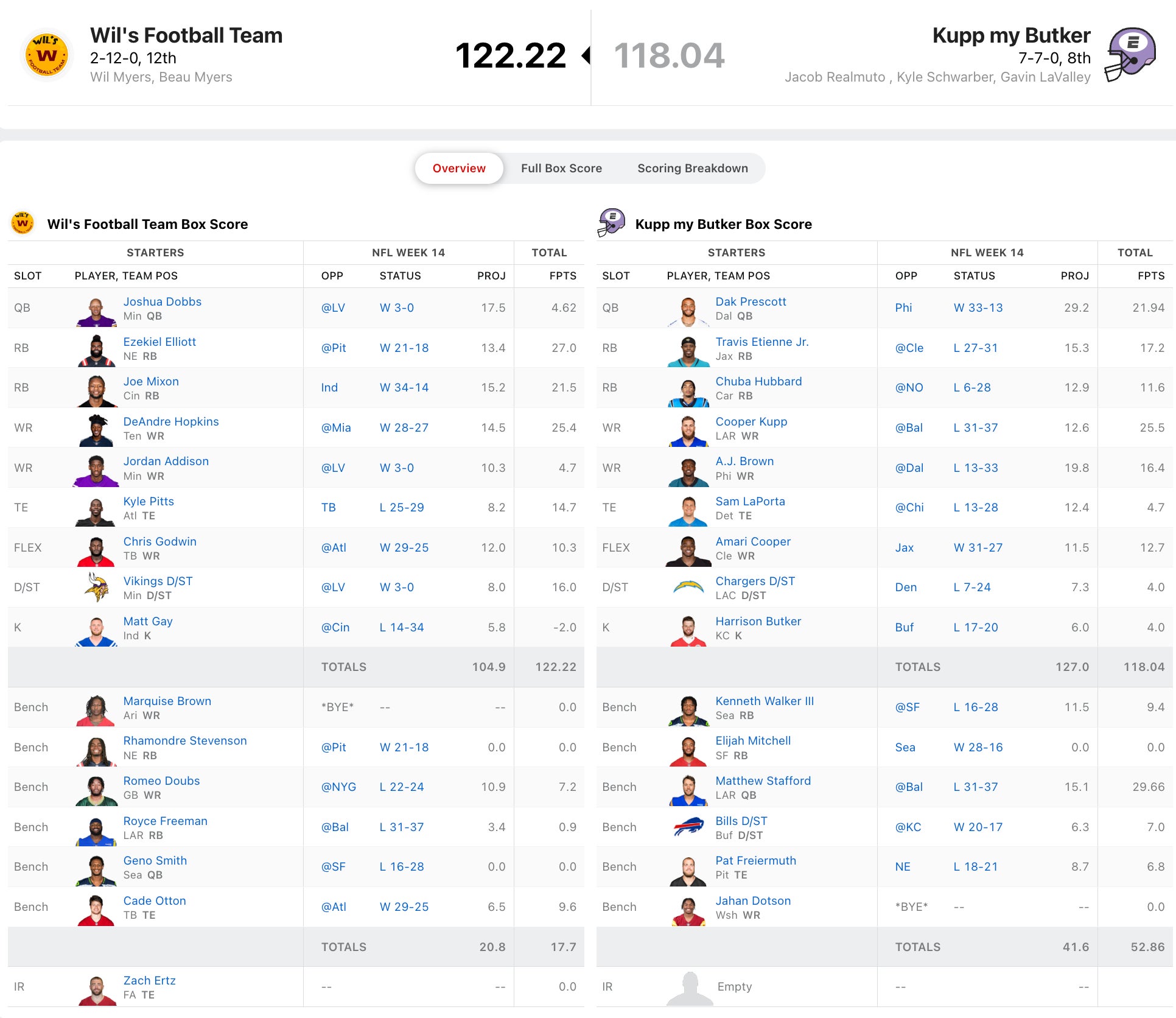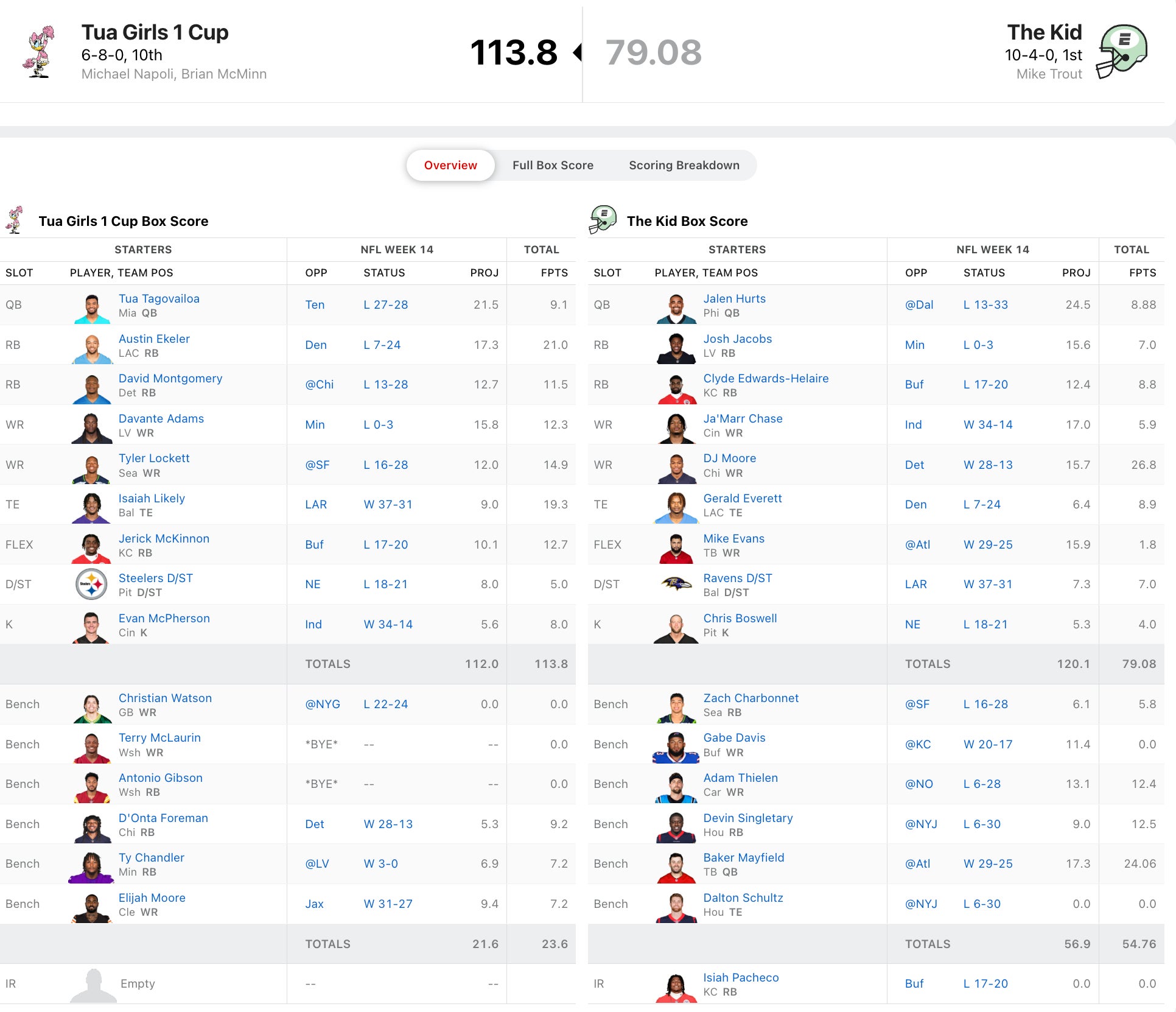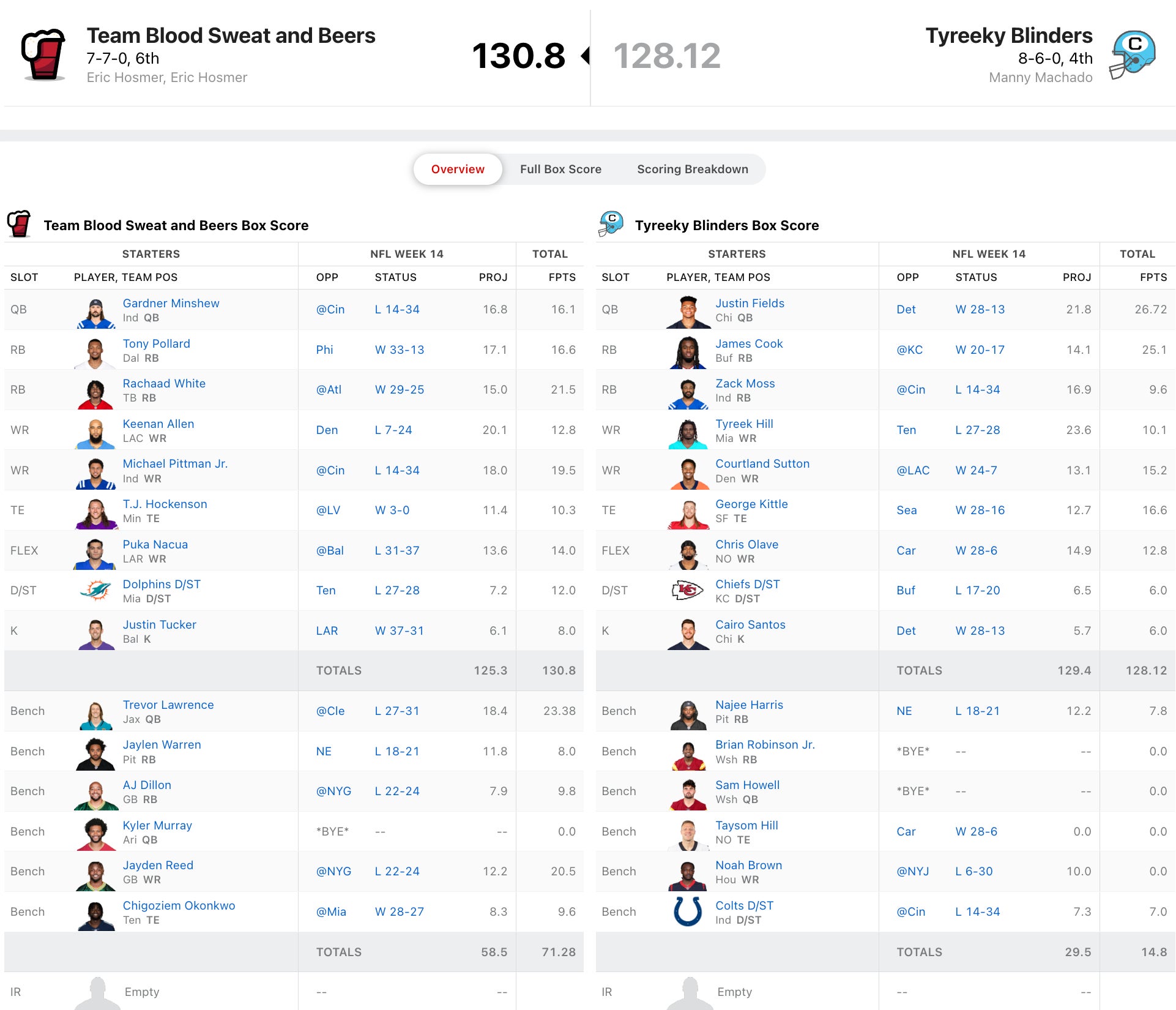 Not much longer after, Tyreek Hill gets hurt and exits the game. Late in the game, Dave needed Hill to have 1 catch for 17 yards on the final Dolphins drive and he'd secure a playoff spot. Unfortunately, Tua did not look his way and the Dolphins turned it over on downs. The league's leading point scorer, Eric Hosmer broke through and pulled out the improbably victory to earn the 6th and final playoff spot.