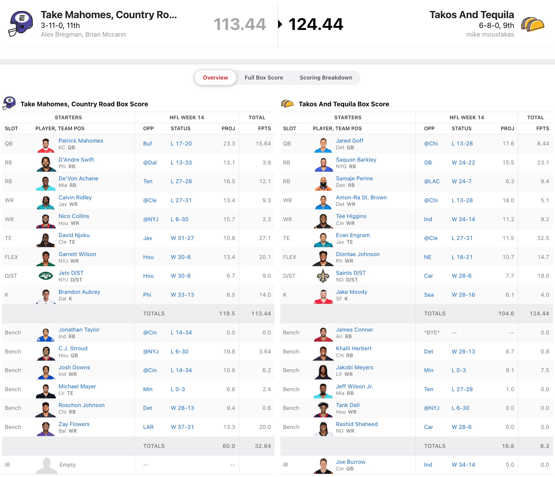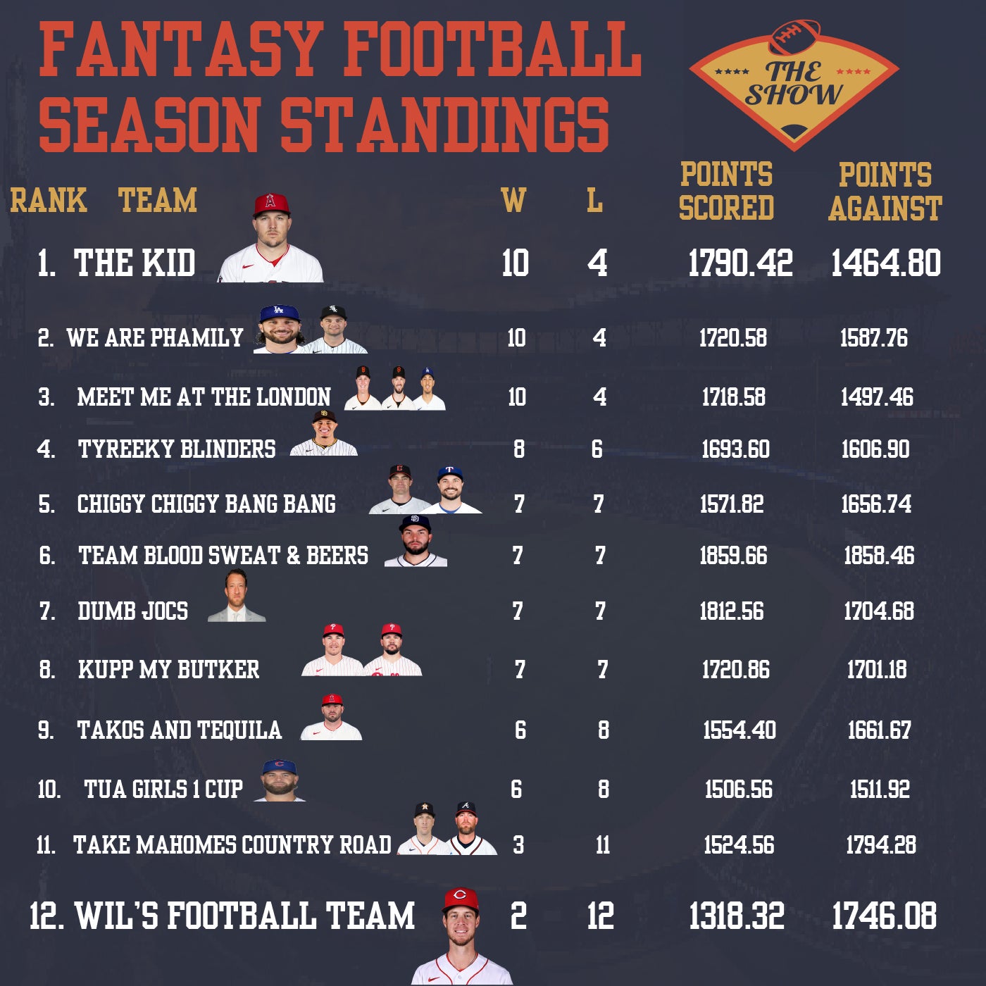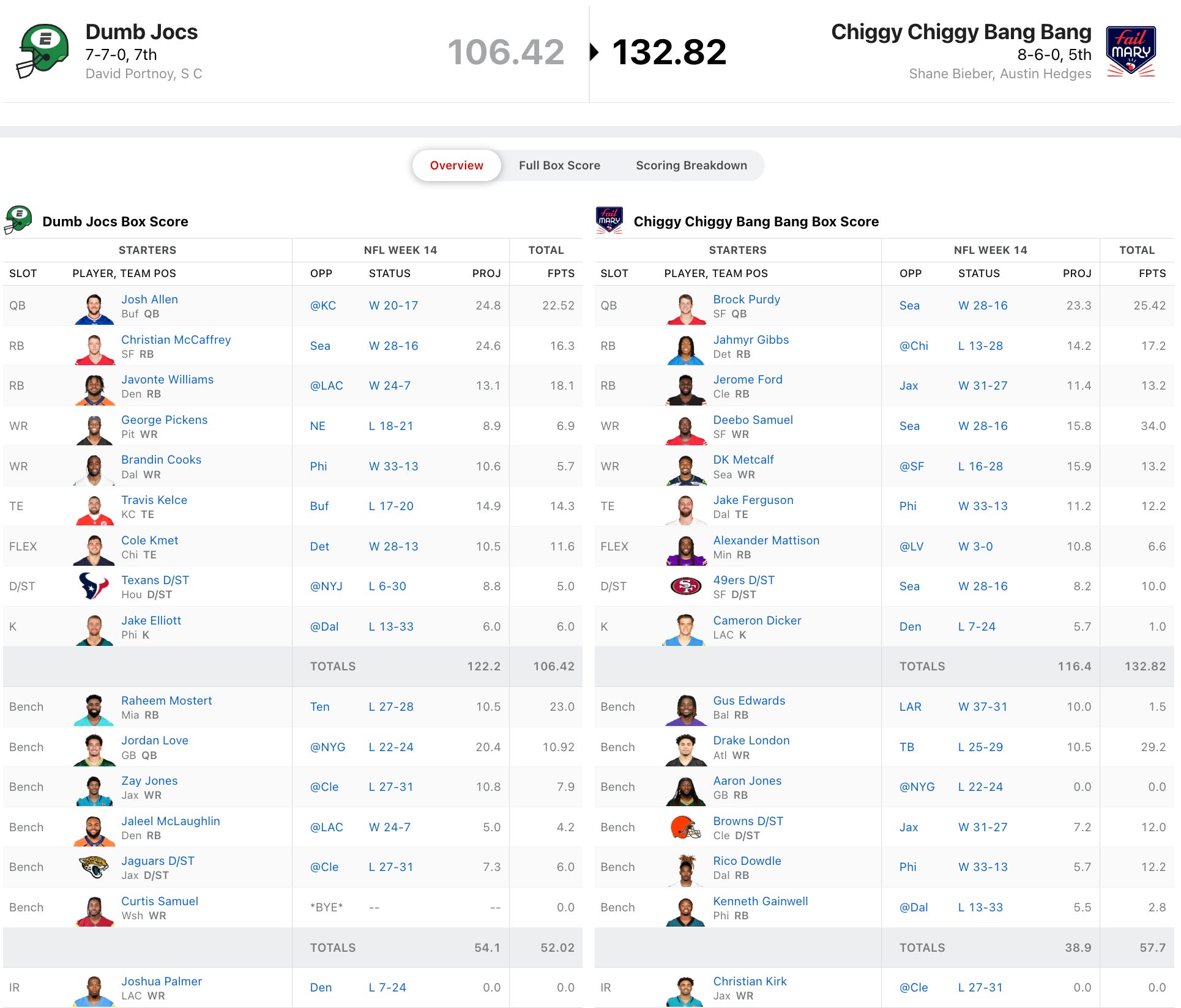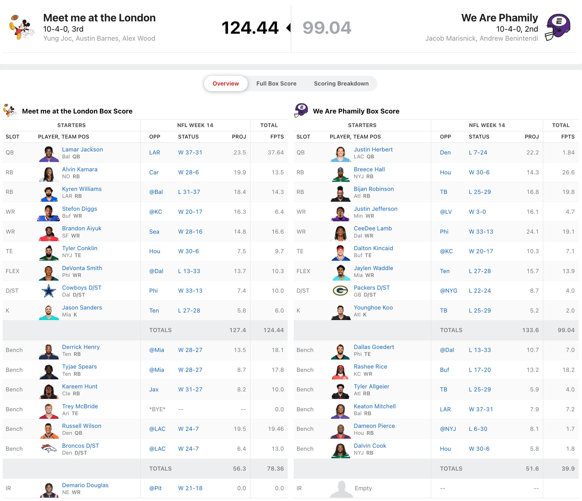 Not much longer after, Tyreek Hill gets hurt and exits the game. Late in the game, Dave needed Hill to have 1 catch for 17 yards on the final Dolphins drive and he'd secure a playoff spot. Unfortunately, Tua did not look his way and the Dolphins turned it over on downs. The league's leading point scorer, Eric Hosmer broke through and pulled out the improbably victory to earn the 6th and final playoff spot.