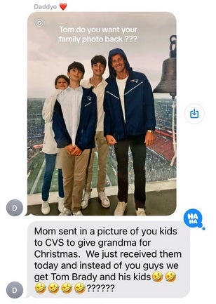 Mom sent in a picture of you kids to CVS to give grandma for Christmas," he explained in the message. "We just received them today and instead of you guys we get Tom Brady and his kids 🤣 🤣 🤣 🤣 🤣 🤣??????"