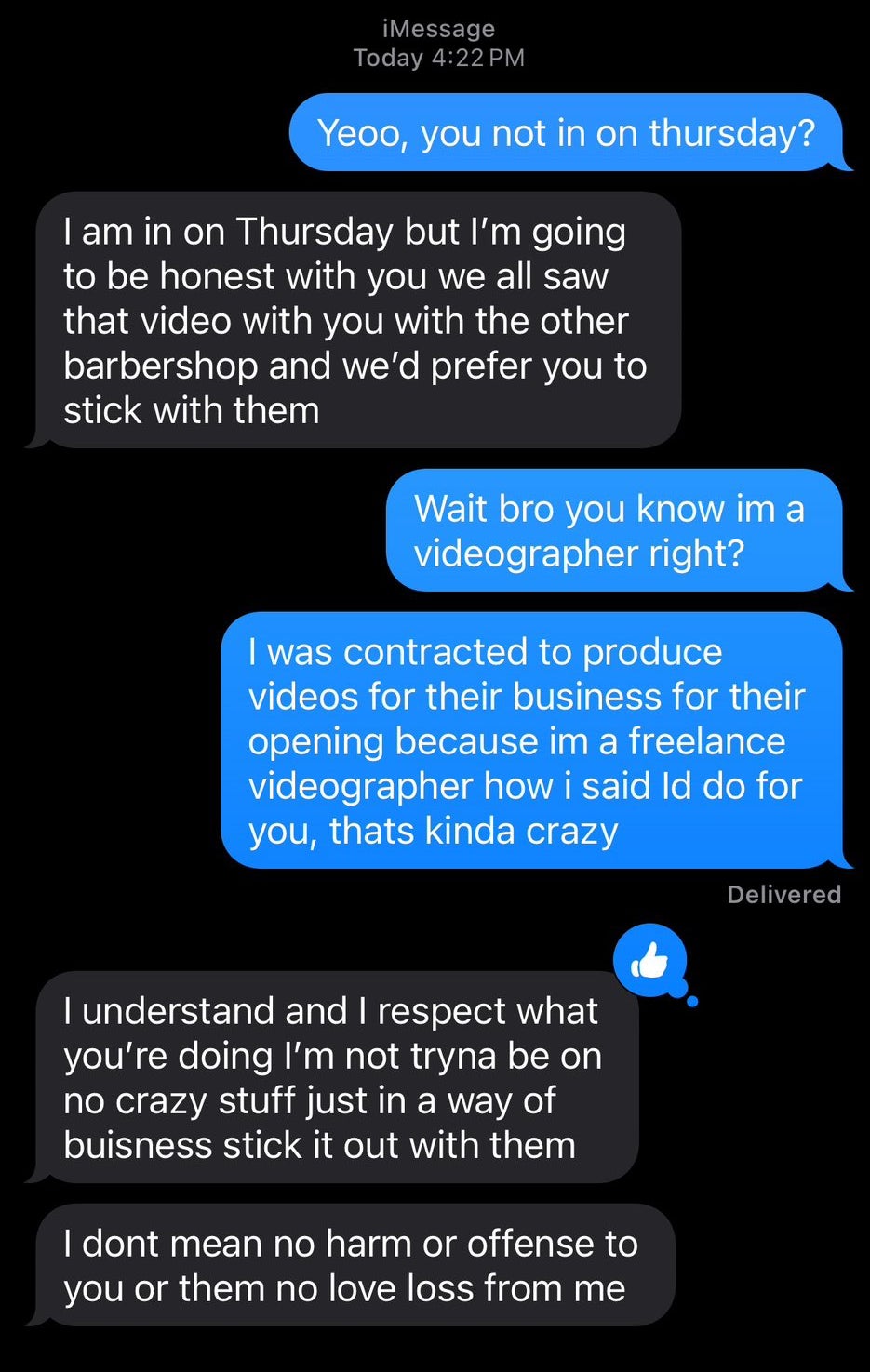 With that being said, this is maybe the softest interaction I've ever read from a business owner. I initially thought that maybe these were competing shops, to which you'd maybe give a little more leniency here from the psycho barber, but nope. The poor fella without a haircut said they're in two different markets: