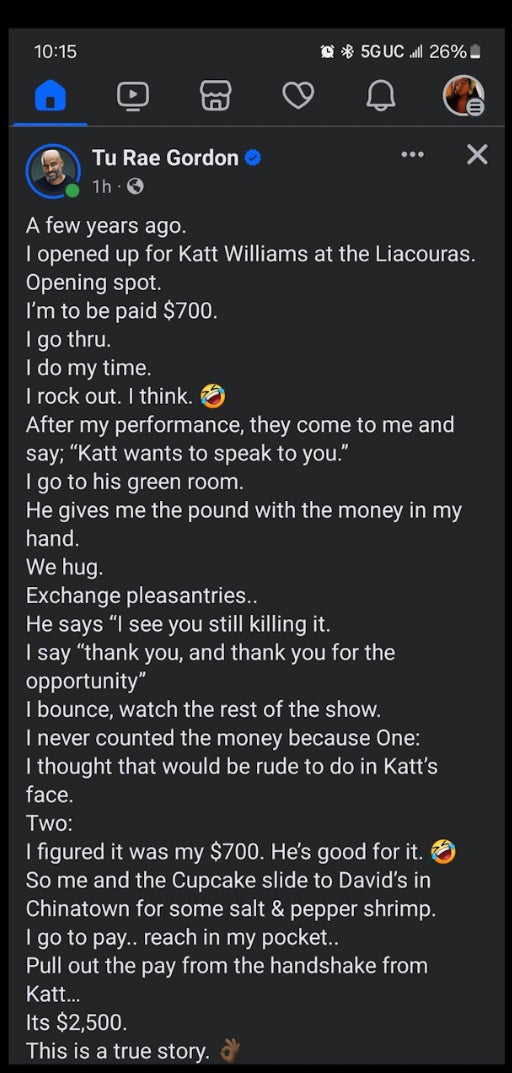 I gotta say this was the real one that sold me. My take is this, guys like this don't remember intricate details from YEARS ago by accident. They knew times, they knew dollar amounts etc. People who do the right thing stand out just as much as people who do the wrong thing. And people who treat people the right way always get remembered with just as much admiration as those who treat people like shit do with hatred. These two comics 100% are telling the truth in my opinion and it goes to show what kind of guy Katt Williams is. Man of his word … which makes me think in this battle of words and shots I wasn't expecting nor did I care to take a side on, I am now very much on Katt Williams side and not because it's the cool thing to do, or I made my opinion off a one minute TikTok, it's because much like Katt said he was keeping receipts … so did everyone else, and those receipts are what's backing up his story. But. hey that's just my take #healthydebate