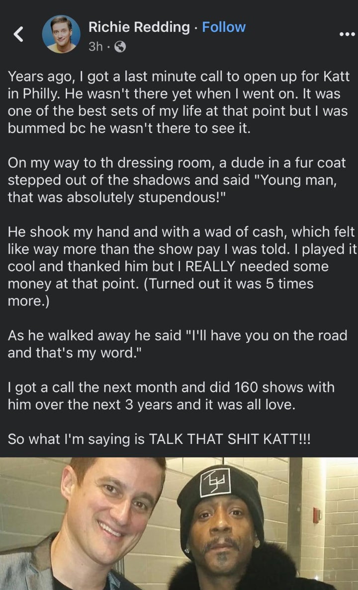 This was the one I was most interested in, take a look at these two stories from Tu Rae Gordon and Richie Redding defending Katt Williams in their time meeting him/opening for him.