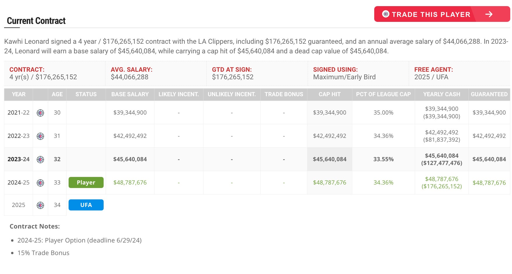 Yeah, you usually don't see a player turn down a $48M option unless another fully guaranteed max was heading his way, and I'd say 3/152M fits the bill. Steve Ballmer obviously has the money, and now Kawhi is locked in for the foreseeable future as the Clippers head into their new arena.