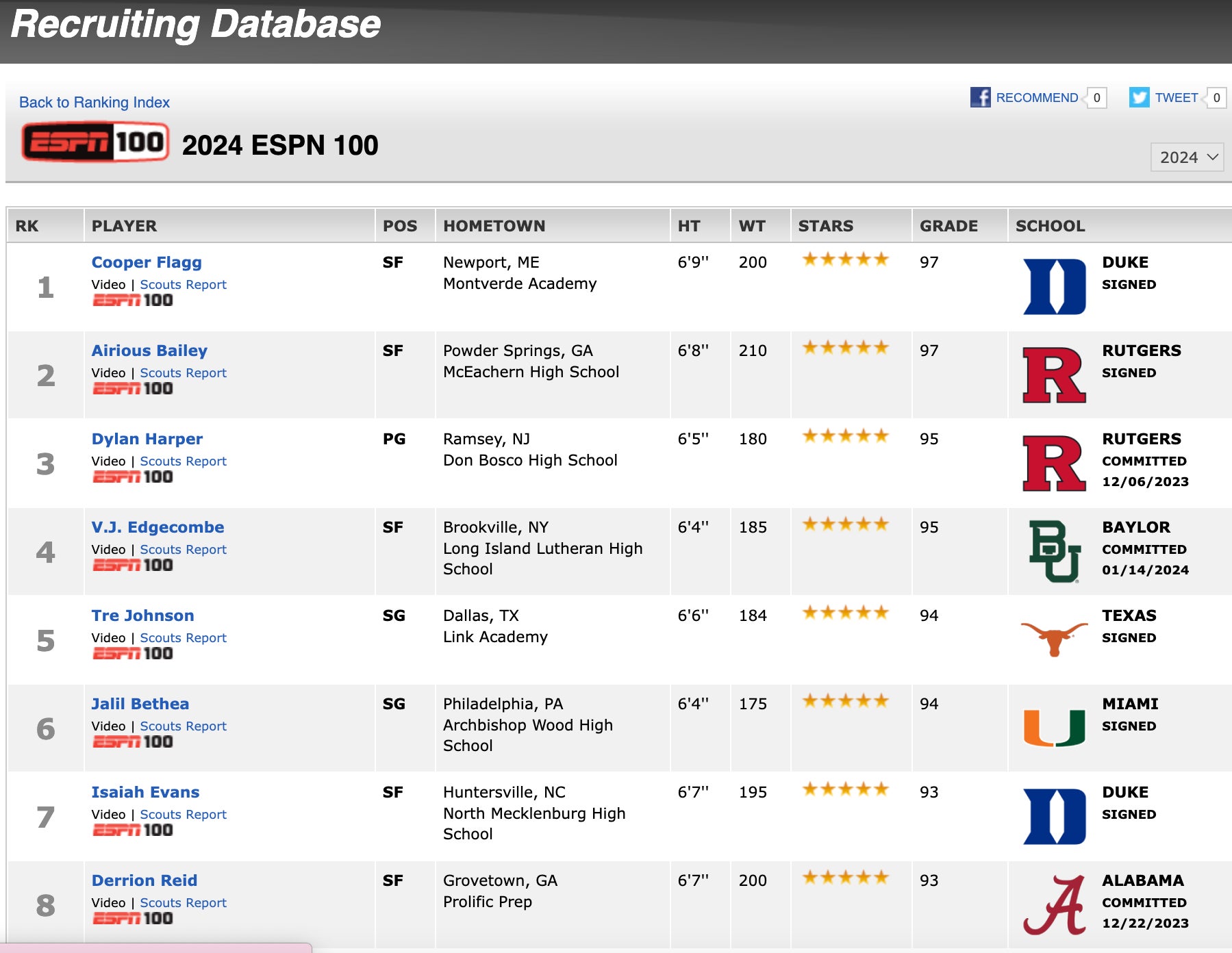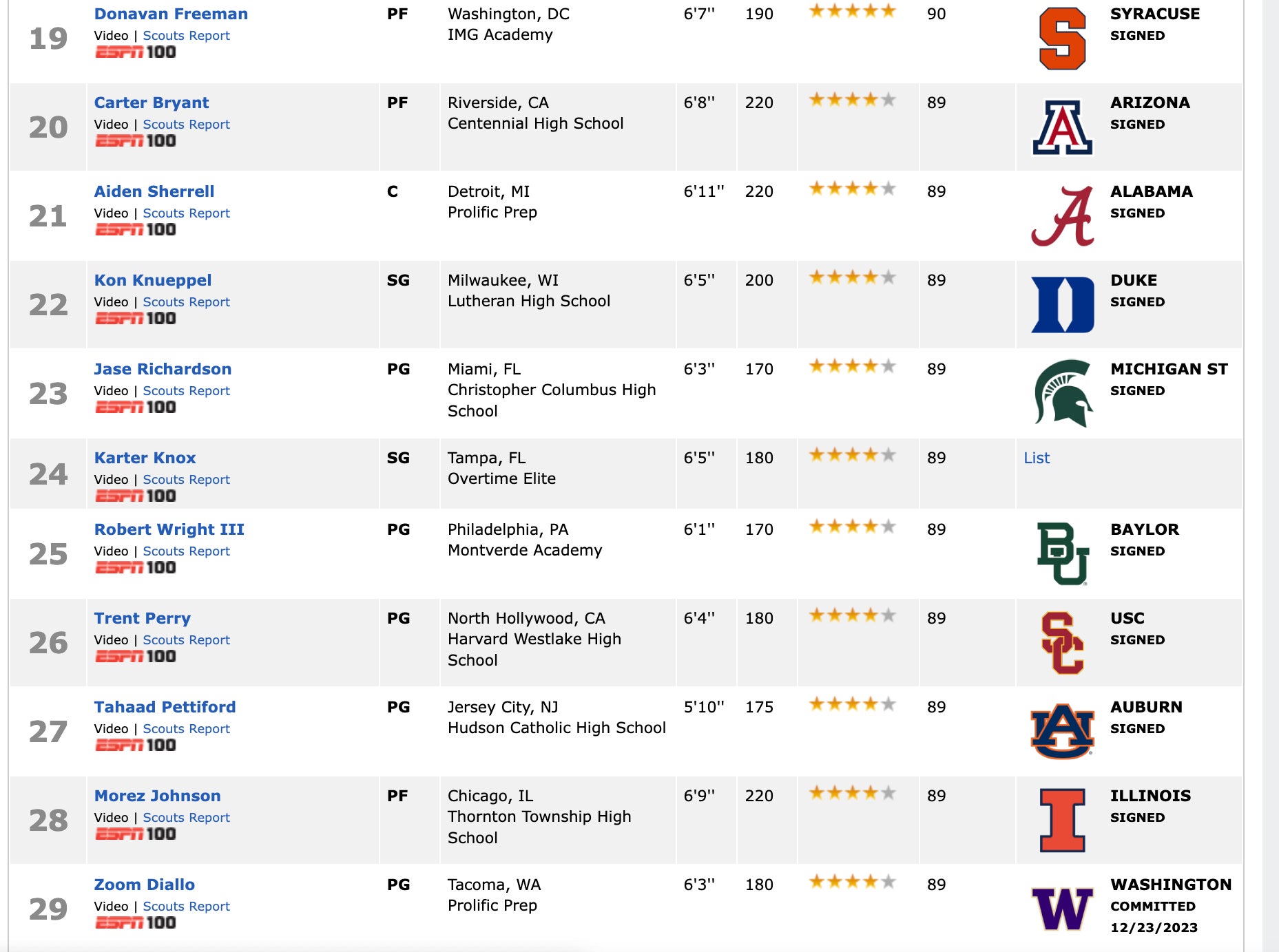 Montverde has 5 players in the Top 25. 247 Sports and Rivals have virtually the same numbers. If you were making a case for the list of 24 best players in the country you could very much make a case all 5 players from Montverde should be on it, you can also without a shadow of a doubt say that at the bare minimum Asa Newell should be on the list considering he's 12th on ESPN, 16th on Rivals, and 13th on 247. He was also selected to an even more selective … Nike Hoops summit.
