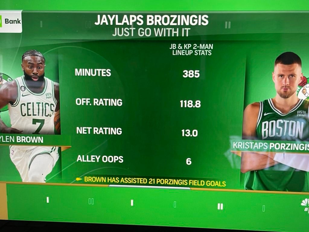 If you look at the Celts' 2 man lineups, Porzingis and Jaylen have shared the floor in 30 games, for a total of 790 minutes. In those minutes together, they have a 122.5 Ortg / 109.4 Drtg / +13.1 net rating. That is the 3rd highest net rating of ANY Celtics pairing who has played at least 790 minutes, trailing only Tatum/White (+13.8) and Jaylen/White (+13.4) which makes sense given that Bald Derrick rules. As you can see, this pairing is clearly working.