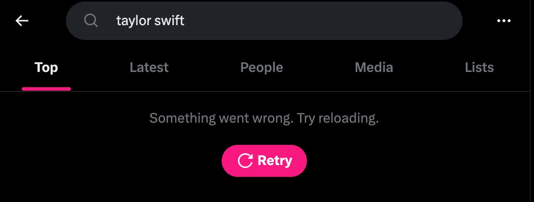 Wow. Screenshotted right from my laptop. It appears as if Taylor Swift is currently unsearchable on Twitter/X, not because of a glitch, but on purpose.