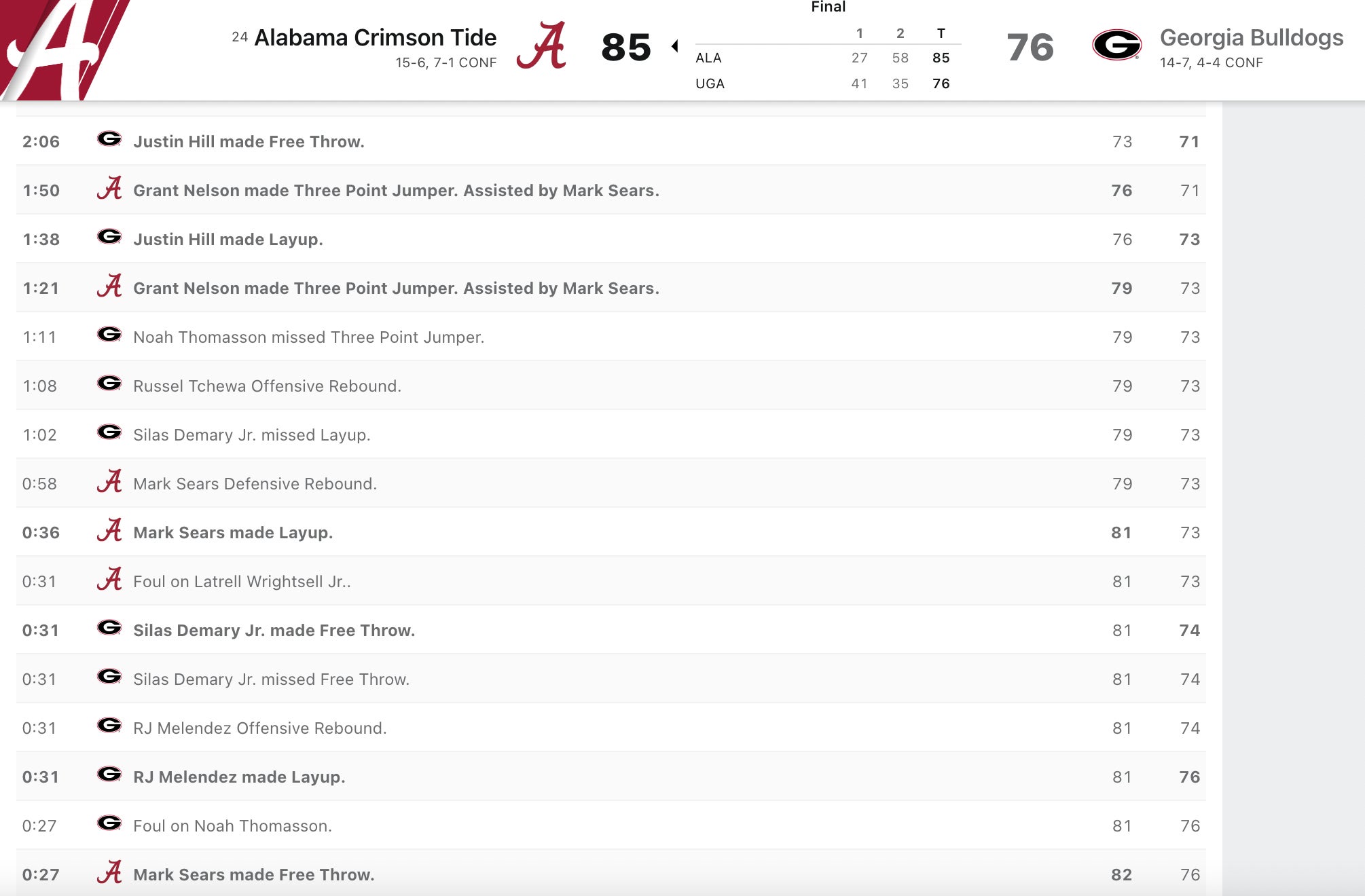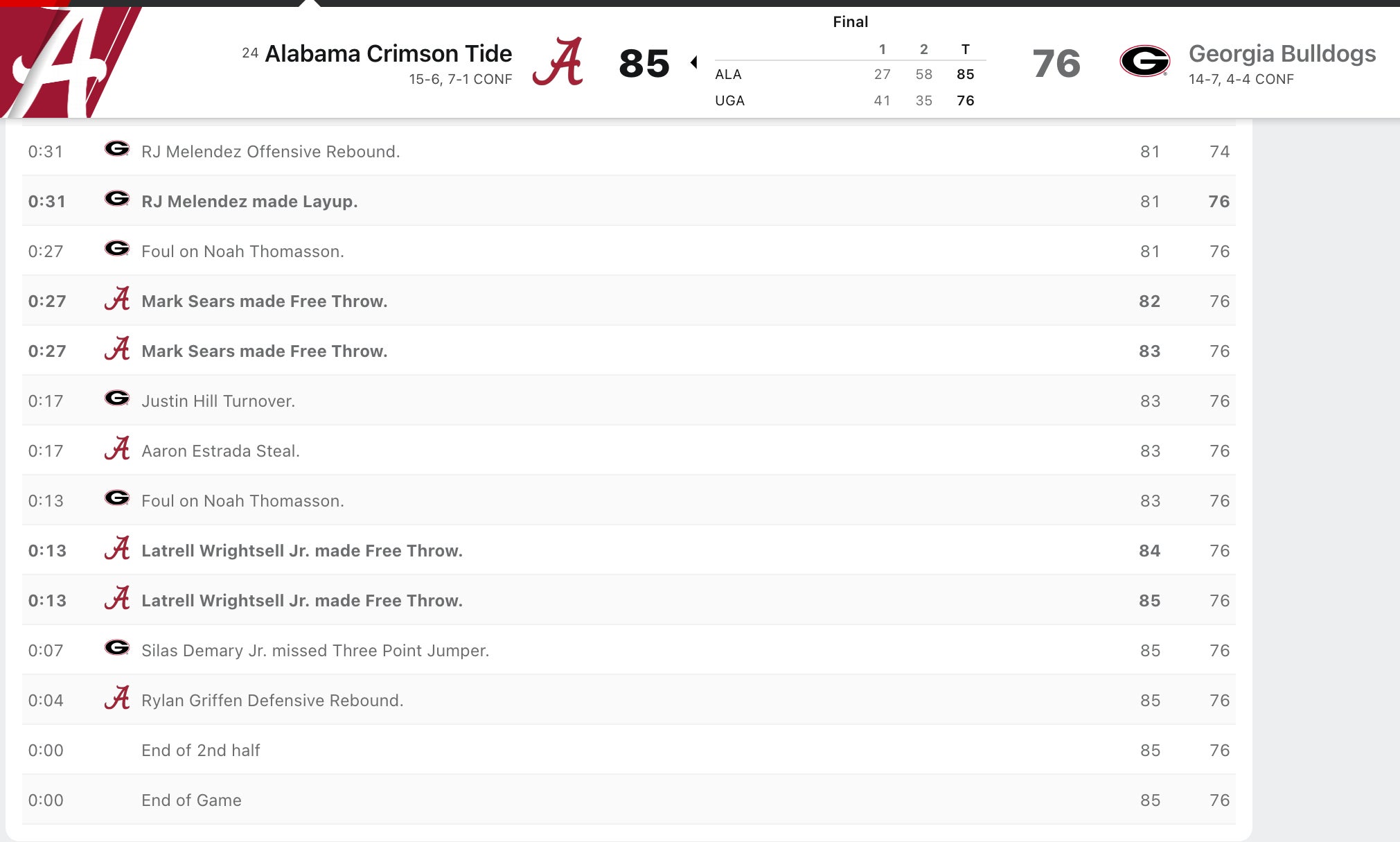 Anyway, things were just as bad on the court as Bama couldn't hit shit (2-11 from 3) while it seemed like Georgia got every rebound in the gym, and shot the lights out. Absolutely as bad as a half as it can get.
