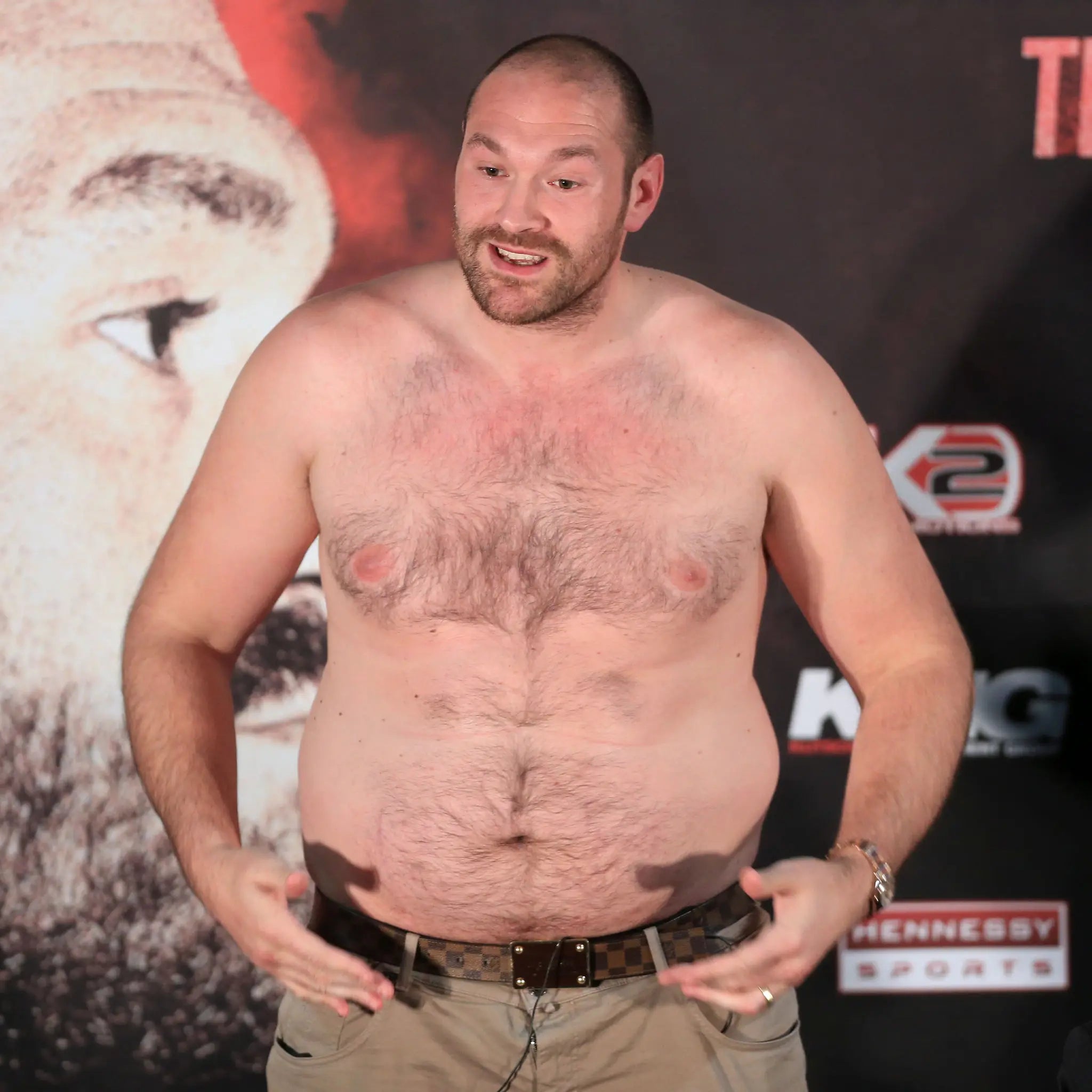 Fury never posted this pic until after he had to back out of the match. Perhaps he was just having a rare bad dick day, so he was too self-conscious about the size of his bulge to post it prior. But looking past his crotch, Tyson looks absolutely JACKED in this shot compared to the aforementioned pile of laundry he has resembled in fights past.