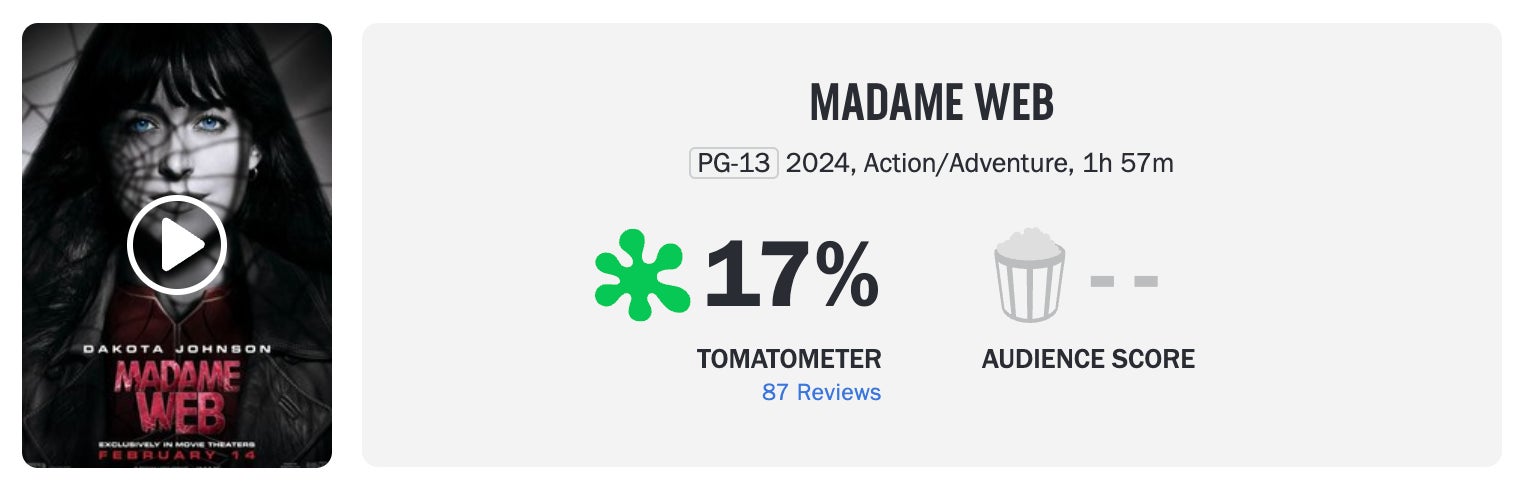 UPDATE: Madame Web has unfortunately dropped to 17% on Rotten Tomatoes….