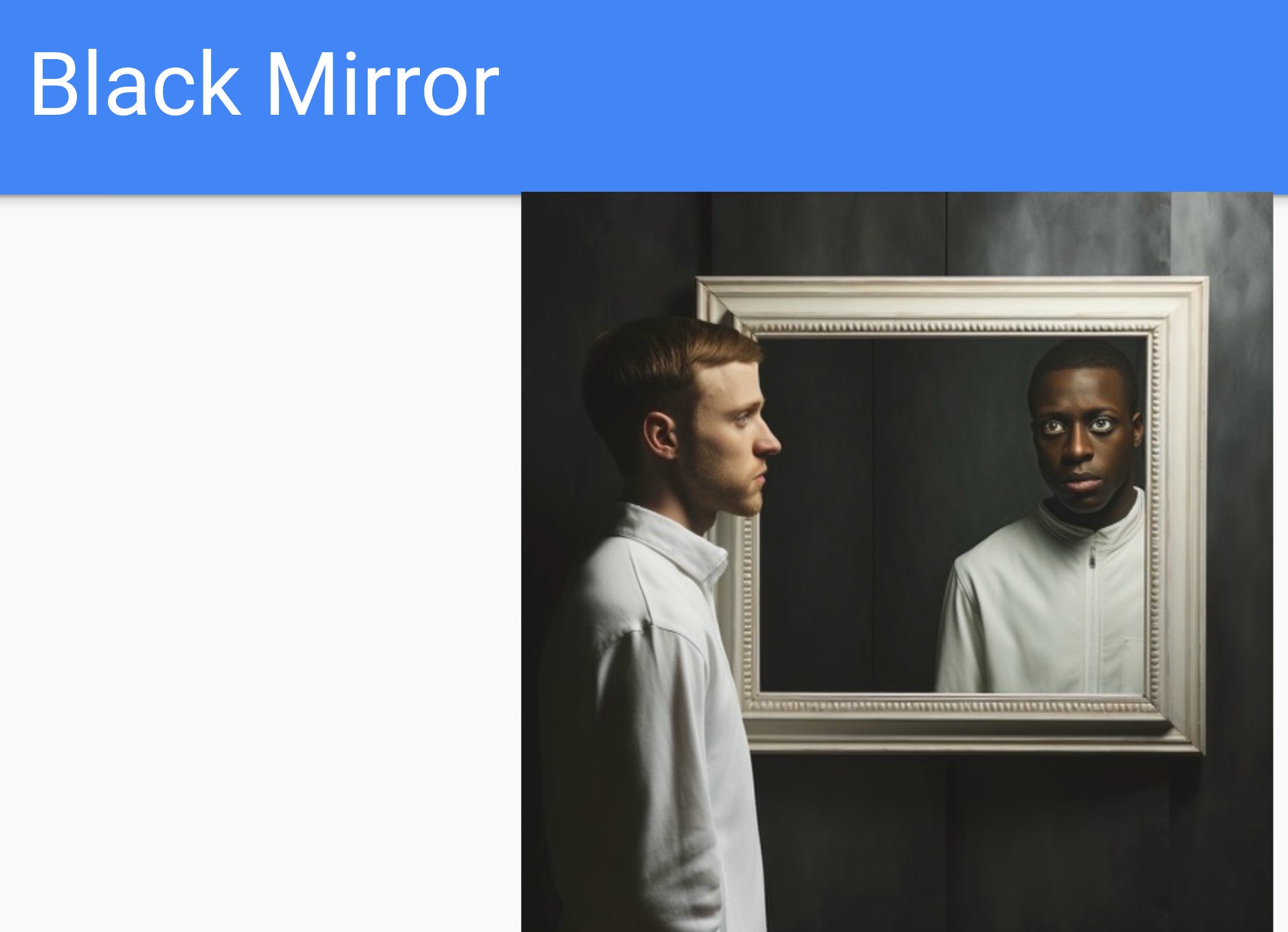 Have you ever wondered what you'd look like black, but you don't want to do blackface and get yourself canceled? Well let me introduce you to Black Mirror (like the TV show). You look in this mirror and see a reflection of yourself as a black person. Just could be cool. Technology is a work in progress.