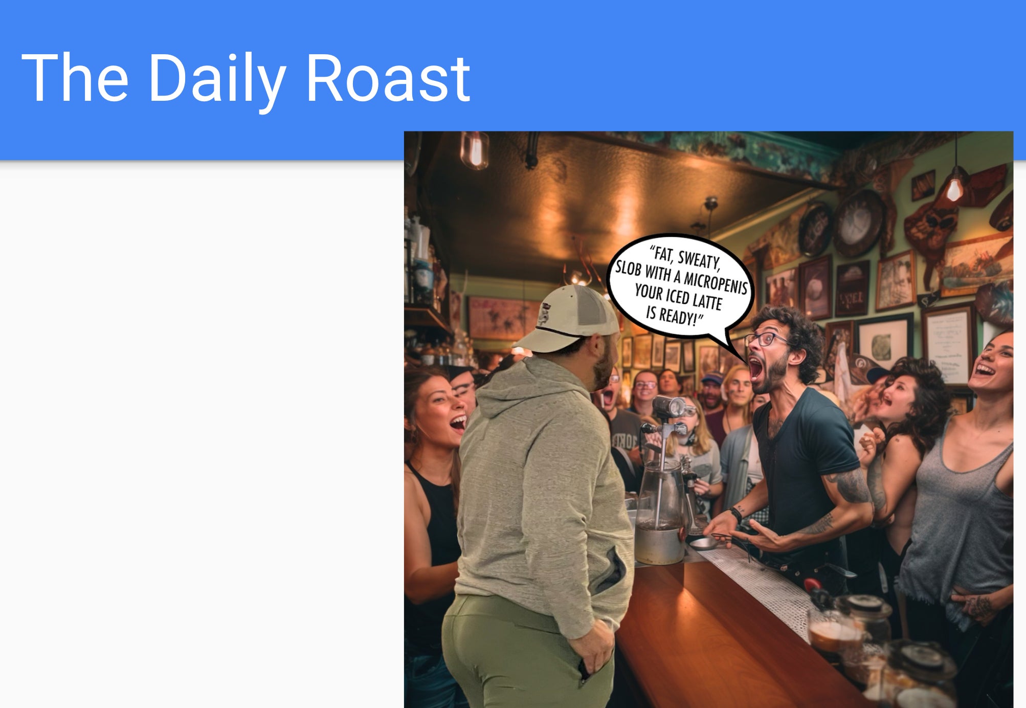 A comedy coffee shop! At most boring coffee places, you just give your name with your order. Well not here. At the Daily Roast, the barista assigns a mean physical description to you that cuts you down at your core. For example, instead of saying, "Dana, here's your triple mocha chocolate frappucino" the barista would yell out "Fat sweaty slob with a micropenis, here's your triple mocha chocolate frappucino." Keeps things fun!