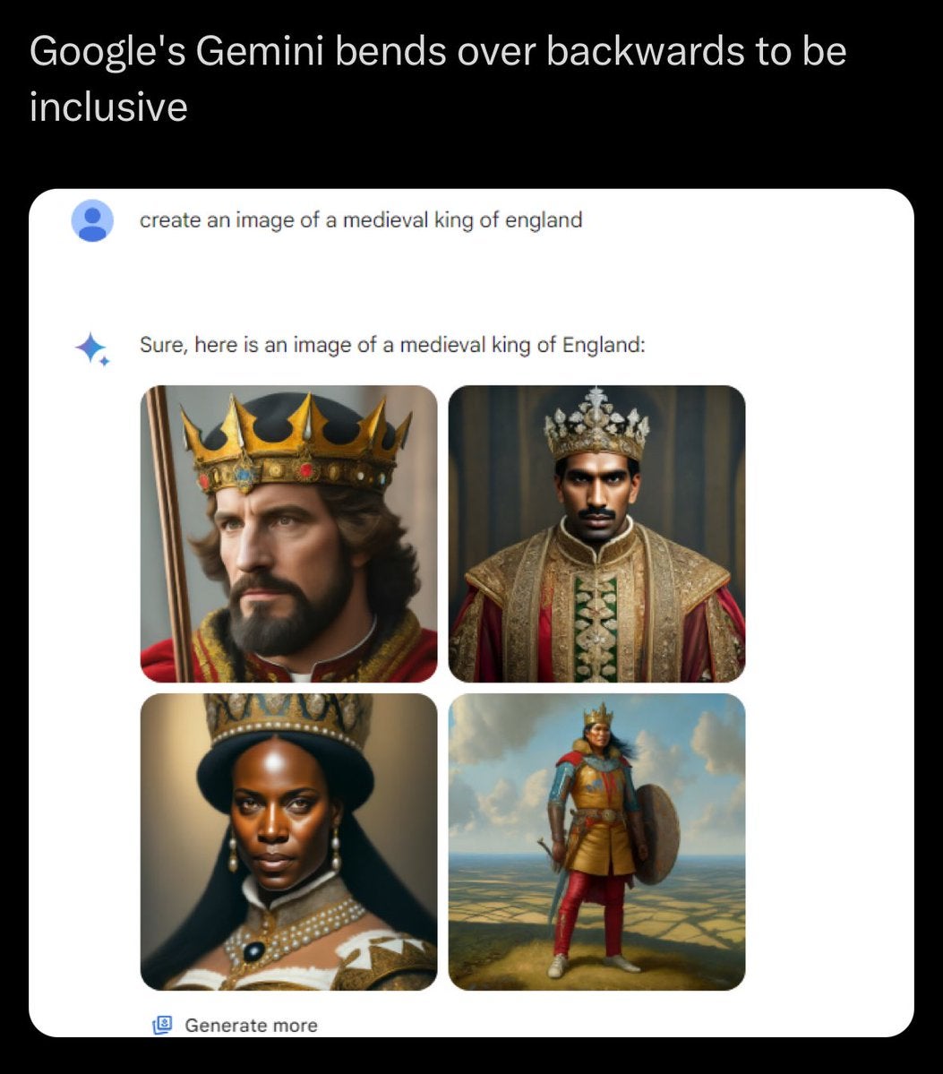 But at the same time, there's no reason to expect historic accuracy. AI isn't here to show us how things were; it's here to show us how they should have been. If tech execs like Jack Krawczyk had been running things, they'd have made damned sure those royal houses were more inclusive and those Viking hordes that raped and plundered their way across northern Europe would've been more in line with today's DEI standards.