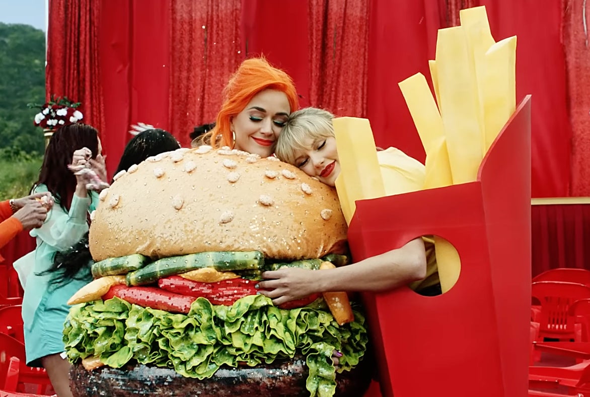 Much to our surprise, when the Lover album came out with the "You Need To Calm Down" music video, who made a guest appearance? KATY PERRY. Dressed as a cheeseburger (she wore this to the Met Gala) and Taylor threw on a french fry costume. Reunited at last, beef squashed, proof that women can overcome pettiness for real friendship, with time: