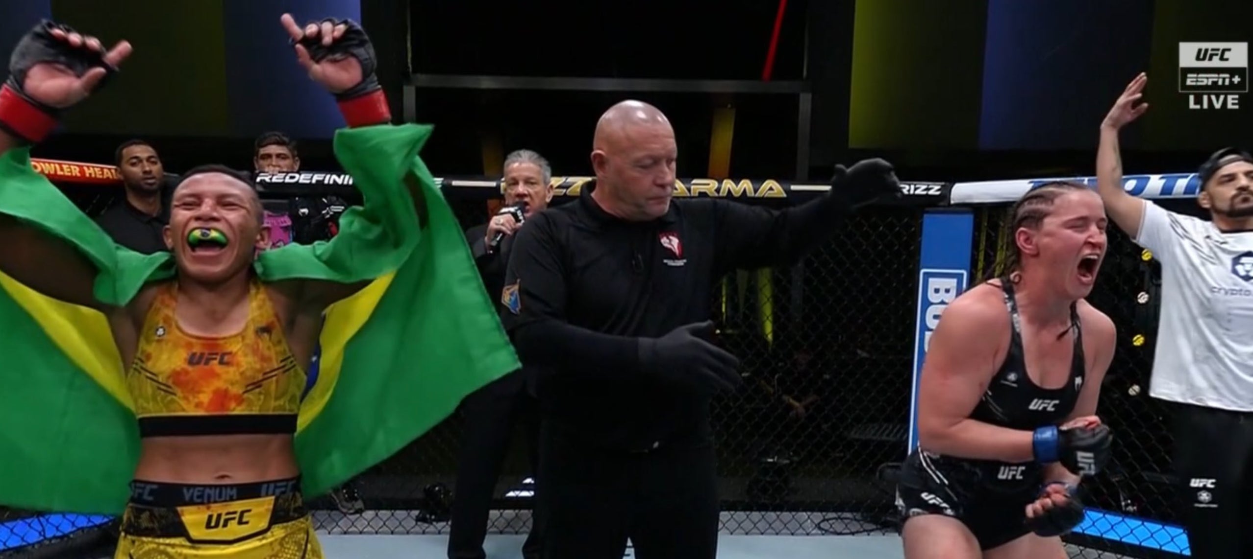 Check out that above GIF/screenshot. Without any audio, it's kind of a crapshoot trying to guess who won that fight. Both girls are celebrating, but I'd argue Josiane Nunes (on the left, with the Brazilian flag) looks happier, if anything - which is a bit weird!