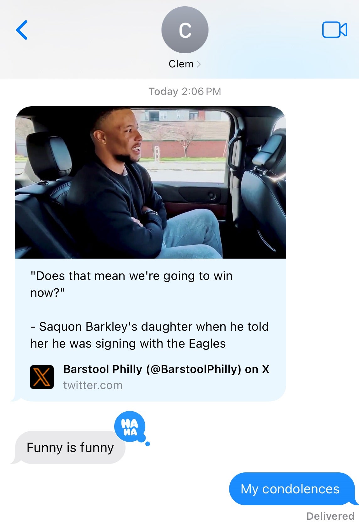 DAMNNNNNN!!! Nice to see closet Eagles fans are all over the place, even well behind enemy lines. And rightfully so. Little Benedict Barkley over here couldn't WAIT to switch over to the winning team. You think Saquon's daughter was alive when the Giants won their last Super Bowl or when Eli Manning left the league after over a decade of .500 play? Exactly. Giving her Daddy playoff PTSD at the diner with spotting a bird and saying the "Oh no, oh no! It's the Eagles!" means she knows how the game is played. And won.