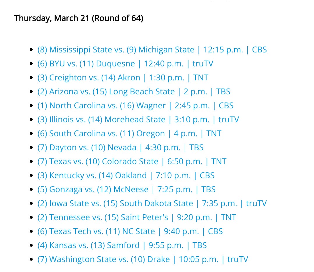 This is basically what everyone is looking for on the first day and something we're getting used to. Looking around the schedule and there's Samford, McNeese, Duquesne as popular picks. I'm terrified of seeing Oakland right now. Too many people falling in love with Kentucky. I think Akron can try to dictate tempo against Creighton. Now, everyone is picking Samford and McNeese which means we're probably getting the upset somewhere else. This is the beauty of the entire first day because you're trying to figure out the 'tone' for the NCAA Tournament like it fucking matters. My dumb brain will do it. 'Oh no upsets day 1, gonna be a bloodbath tomorrow.' My point being, something batshit crazy is going to happen today.