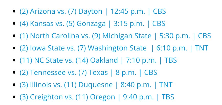 Okay, so I used the word intriguing here because I truly think it is. I love the second weekend. You get the perfect mix of big time matches, the darlings of the 1st round vs a big name, whatever combo. There's an extra level of nervousness of getting out of the first weekend. Look at who is playing too. We'll touch on some of these teams later but Tennessee and Arizona trying to finally make a run. Illinois trying to finally get out of the first weekend. A game between two double-digit seeds. It's a damn near perfect day of TV watching.