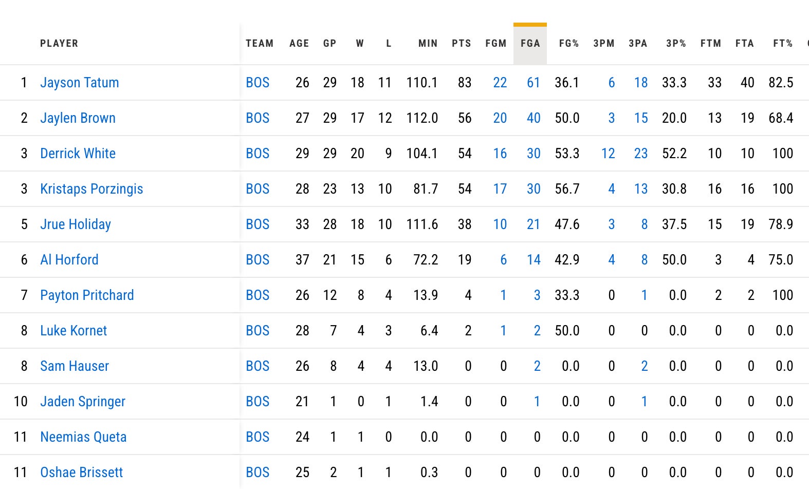 and you can't help but notice that when it came time to take and make a big moment shot, Derrick delivered. The thing is, this has been a trend all season. In 29 clutch time games, Derrick White is shooting 53.3/52.2%. He's 16-30 from the floor and 12-23 from deep. But when it comes to the clutch time shot distribution, as you can see he's pretty far behind the top 2 guys