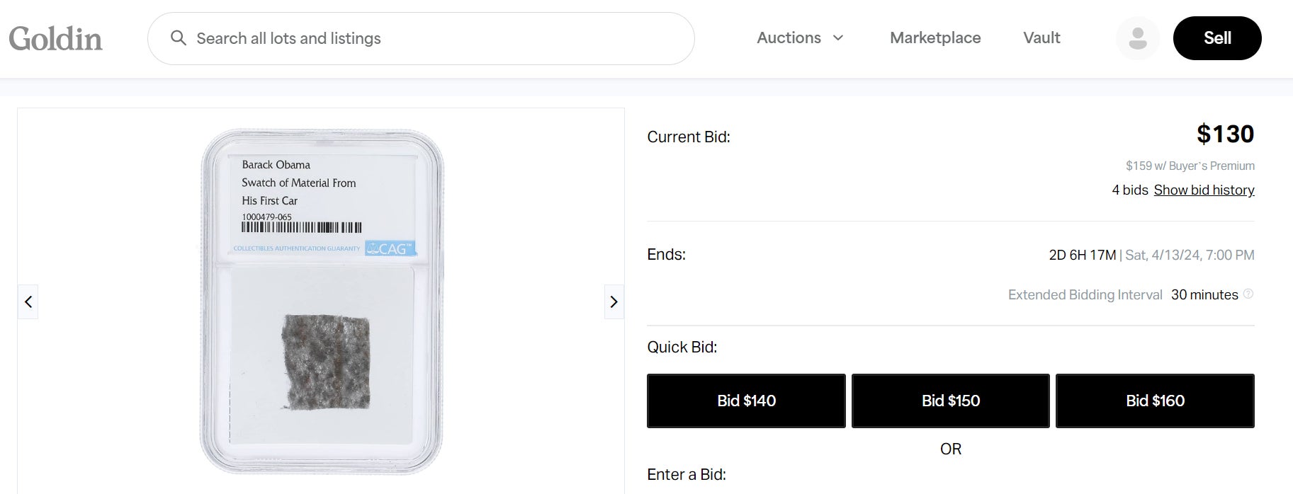 But maybe you're on a budget and looking for something a little more random. Well, you're in luck. Check out this swatch of material from Barack Obama's first car!