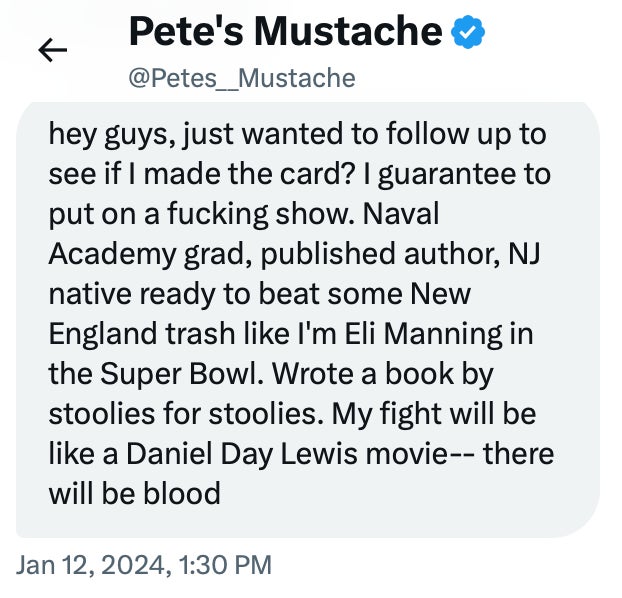 He's been asking to beat up New England trash, West Virginia rednecks, really anyone willing to step in the ring with him. He'll get his wish with a local young buck slash up & coming rapper "Itzcaution" from Clarksburg. Ripped and ready to roll. He don't see NO horns buddy.