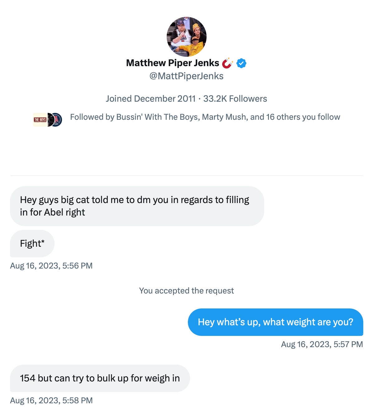 In August, I was doing everything I could to get a job at Barstool. Frank and I were making some great content together, but I needed to do more to get on the bosses radars. I was sitting on my roof enjoying the sunset when I saw on twitter that Spencer Abel’s opponent had backed out of their fight.